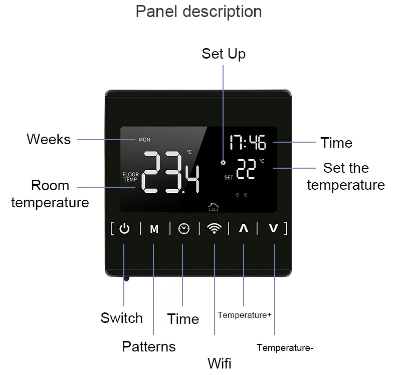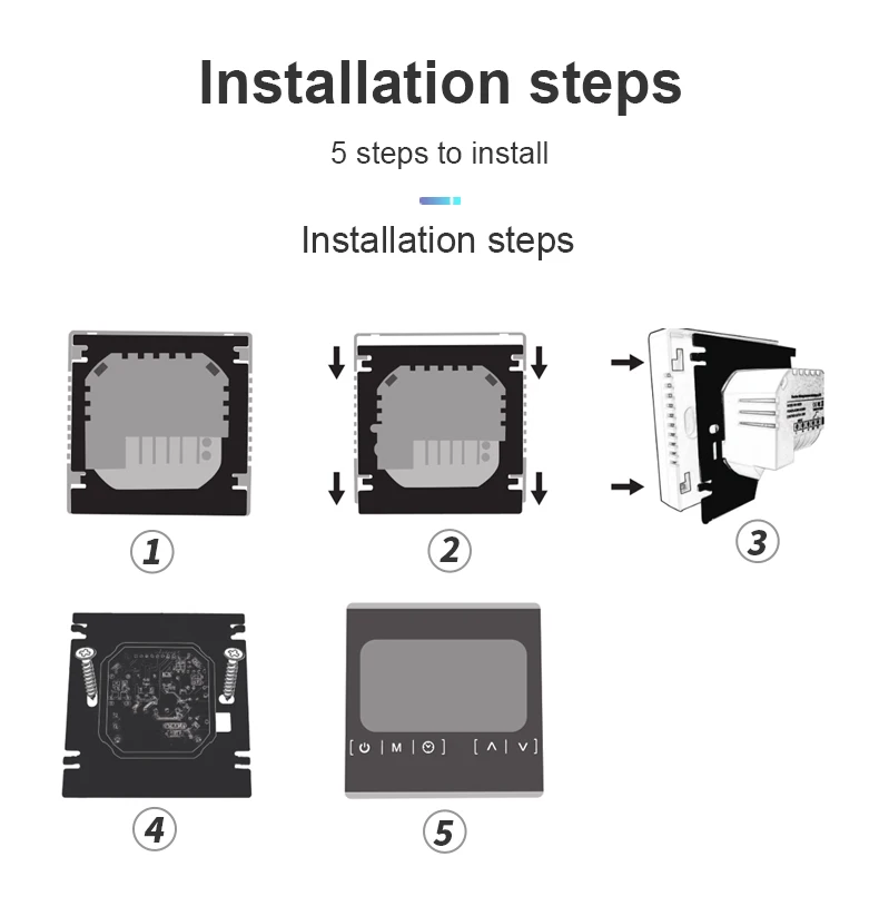 всё работает при первом подключении. сенсор температура 10 ком. железный крепёжные каркас не подходит . его выбрасывать и сразу и думайте как крепить панель.он обрезает изоляцию на проводах при установке панелей в стену.