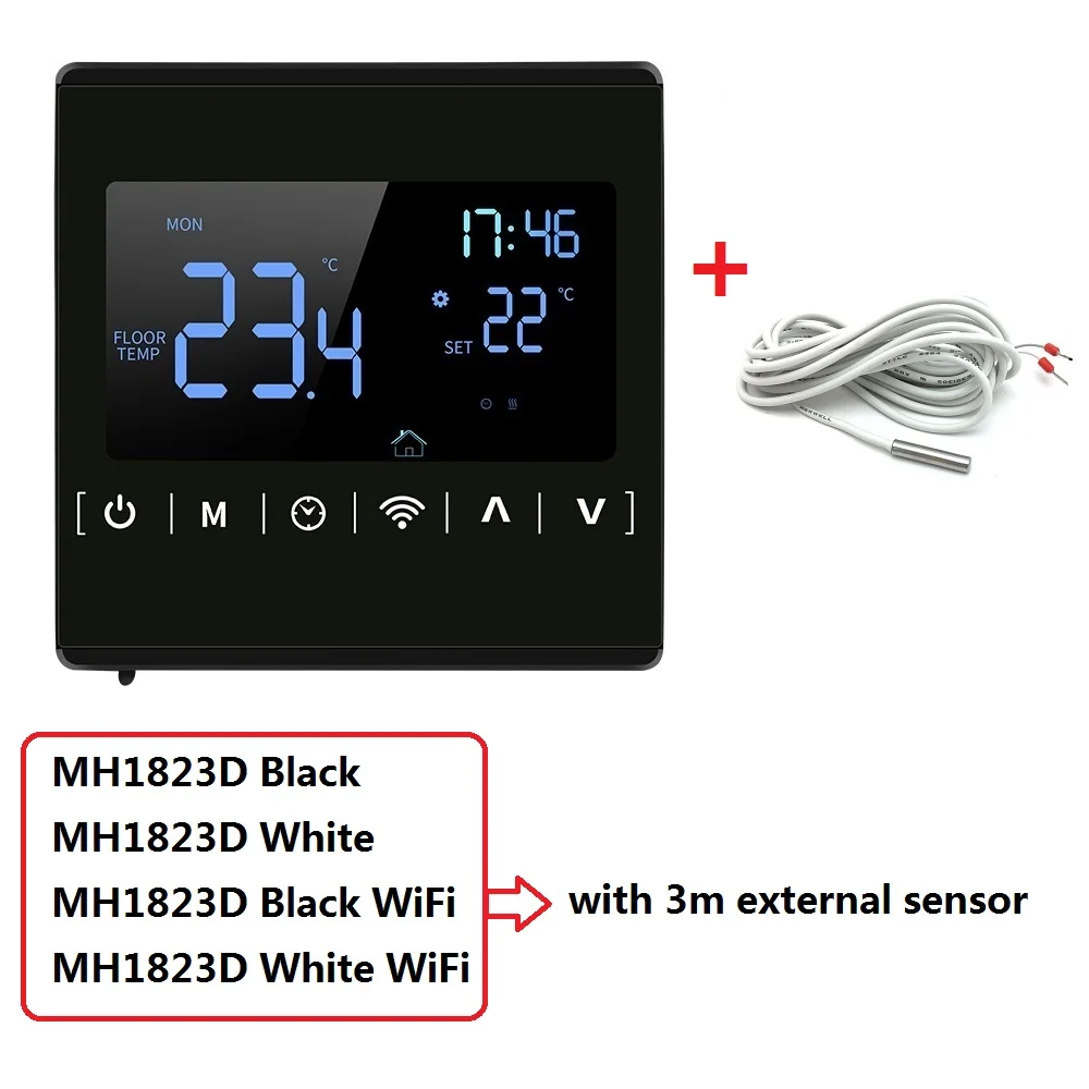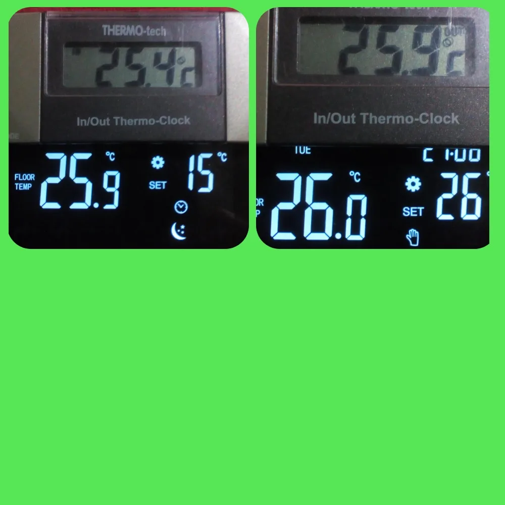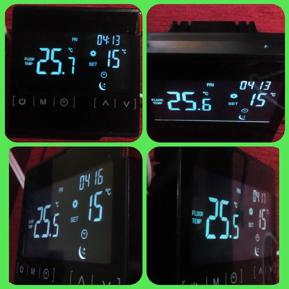 Информации до хрена, а толку нихрена. Заказал 1822, прислали тоже 1822, по описанию от 5 до 38 градусов, вроде без датчика, на фото синяя индикация( в принципе у меня тоже на фото синим получилось). По факту: чисто белая индикация плюс датчик и по описанию как 1823D без WiFi регулировка температуры от 5 до 50 градусов. Не раз просматривал информацию, так и не понятно с какими параметрами эти термостаты. Крепёж конечно просто пипец. О чём думали. Специально чтоб провода этой железкой коротнуть. Времени не было, на скорую руку заказал. В следующий раз надо не спешить с заказами. А так всё работает. На фото с разной яркостью под разными углами. Разница внешний и наружный датчик .