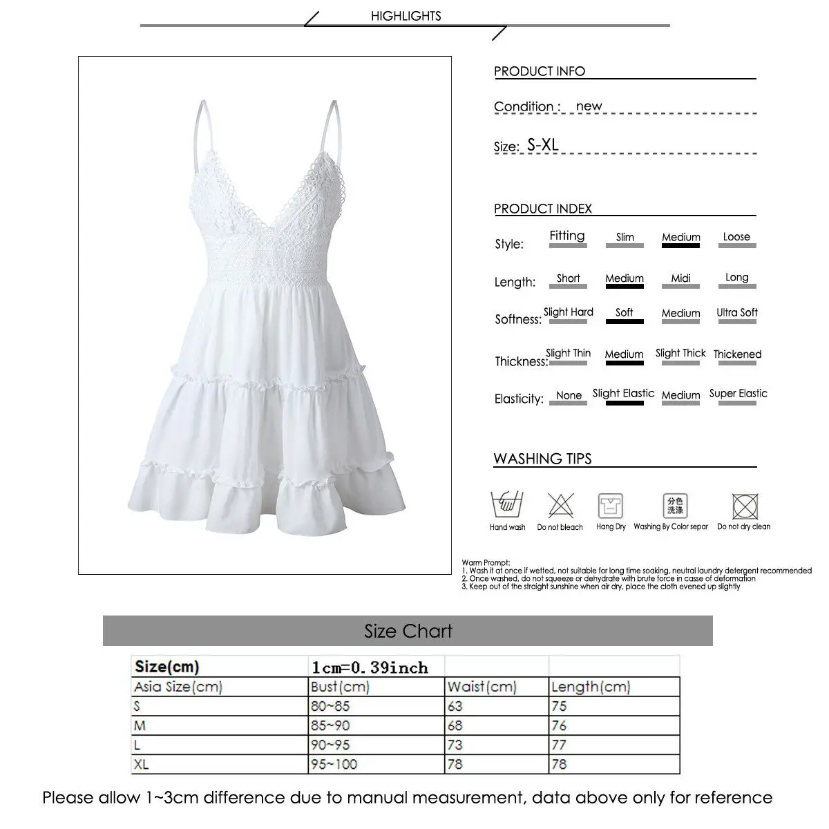 Размеры Тип: Обычный Размер (женский): S-XL Стиль: Открытое платье без рукавов Материал: Из полиэстера и кружева Область применения: Повседневное Платье Длина: Длиной выше колена, мини Рукав Стиль: Платье без рукавов Цвет: Белый Сезон: Летнее платье