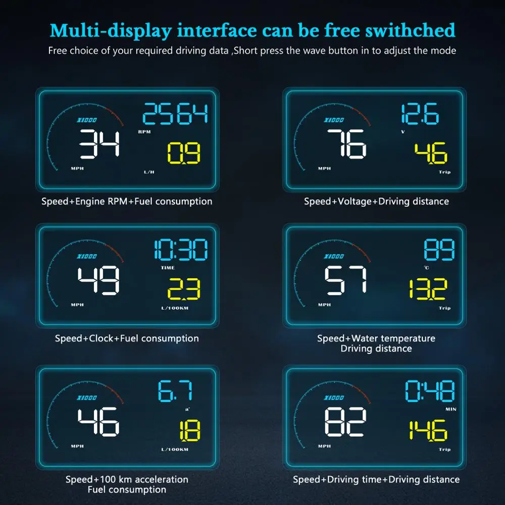 HUD короткий для переднего дисплея. Он отображает данные о вождении на переднем лобовом стекле, такие как скорость, обороты в минуту, расход топлива, температура воды, напряжение; Избегать водителей становится опасным из-за просмотра инструмента во время вождения. Водители могут мгновенно считывать информацию о вождении и всегда могут поддерживать Наилучшее Состояние в пути с HUD.