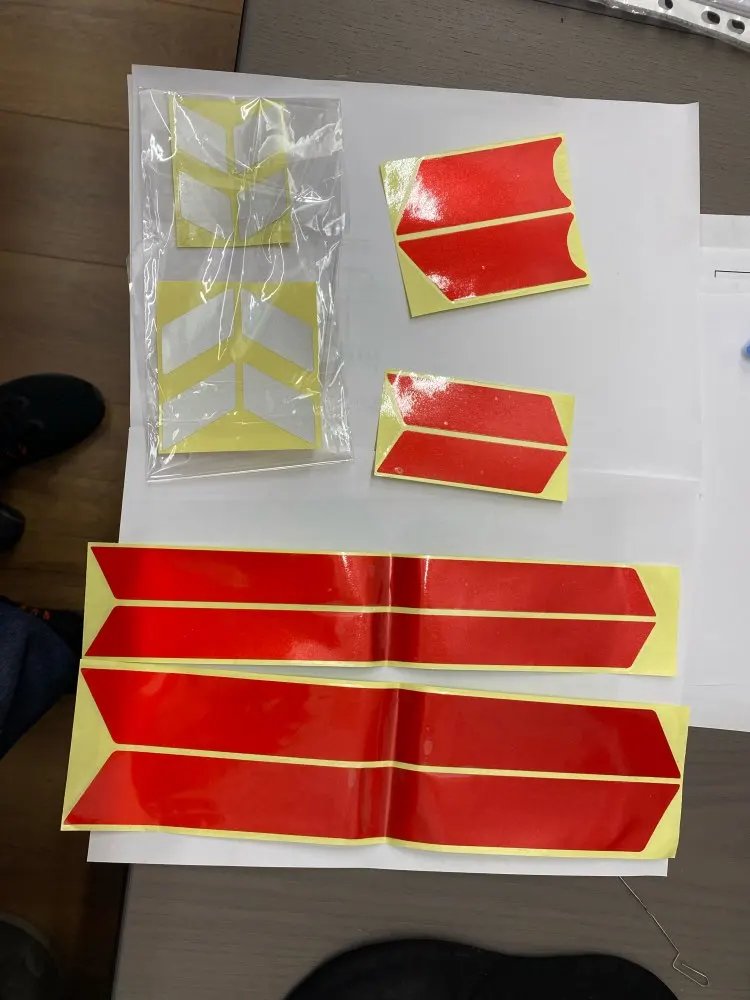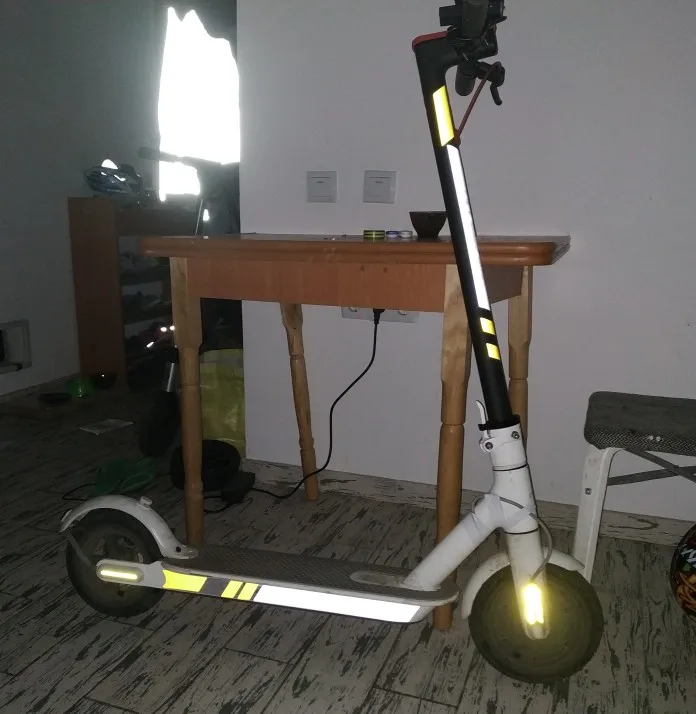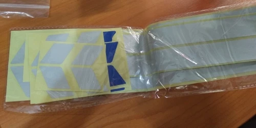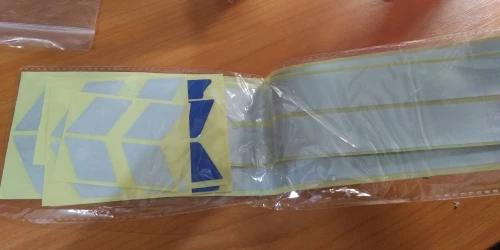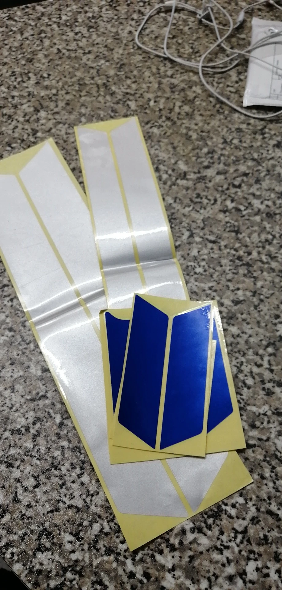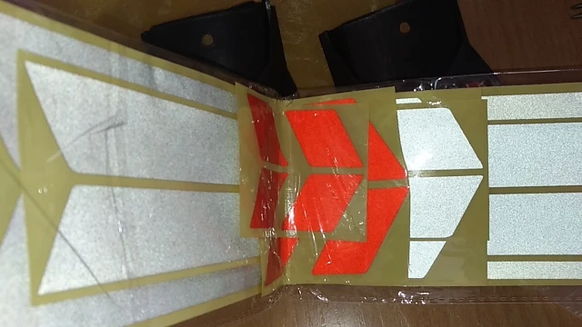 Они выглядят великолепно. Мне было нелегко снять желтую бумагу с первого раза, которая должна быть удалена, а затем, удалив прозрачную, некоторые из маленьких тоже оторвались. Но с небольшим терпением все идет хорошо. Что мне не понравилось, так это то, что белые полосы в области батарей, на стороне зажимной ноги, застряли на ней (и они самые отражающие).