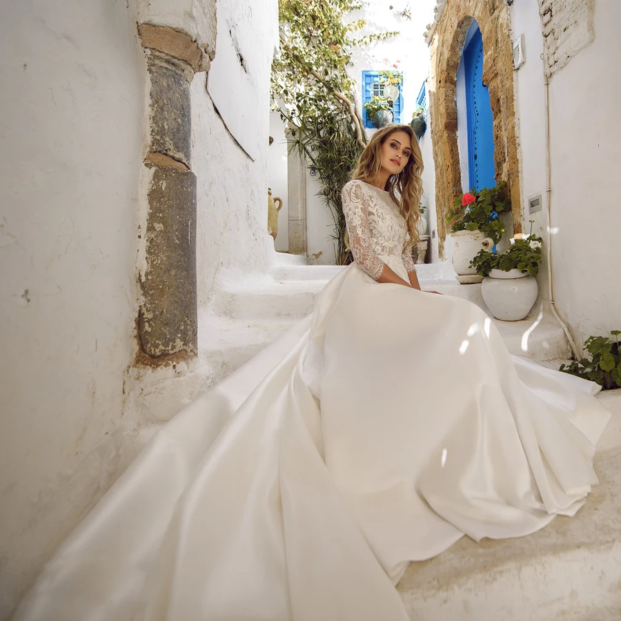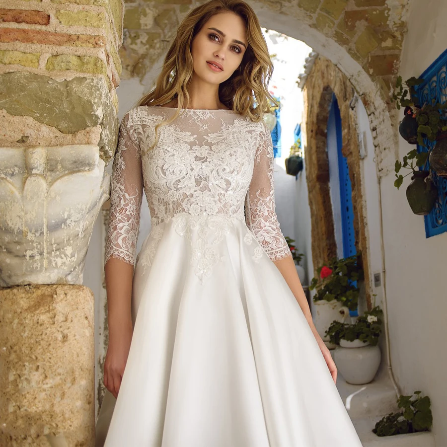 Элегантные свадебные платья Robe De Mariee с вырезом лодочкой, рукавами три четверти, кружевной аппликацией, а-силуэт, свадебное платье для невесты
