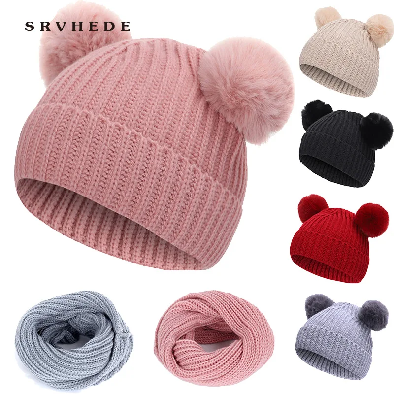 Новинка 2021, зимняя шапка из 2 предметов, шарф, Меховая детская шапка, вязаная теплая шапка с хлопковый помпон помпоном, Детская меховая шапка