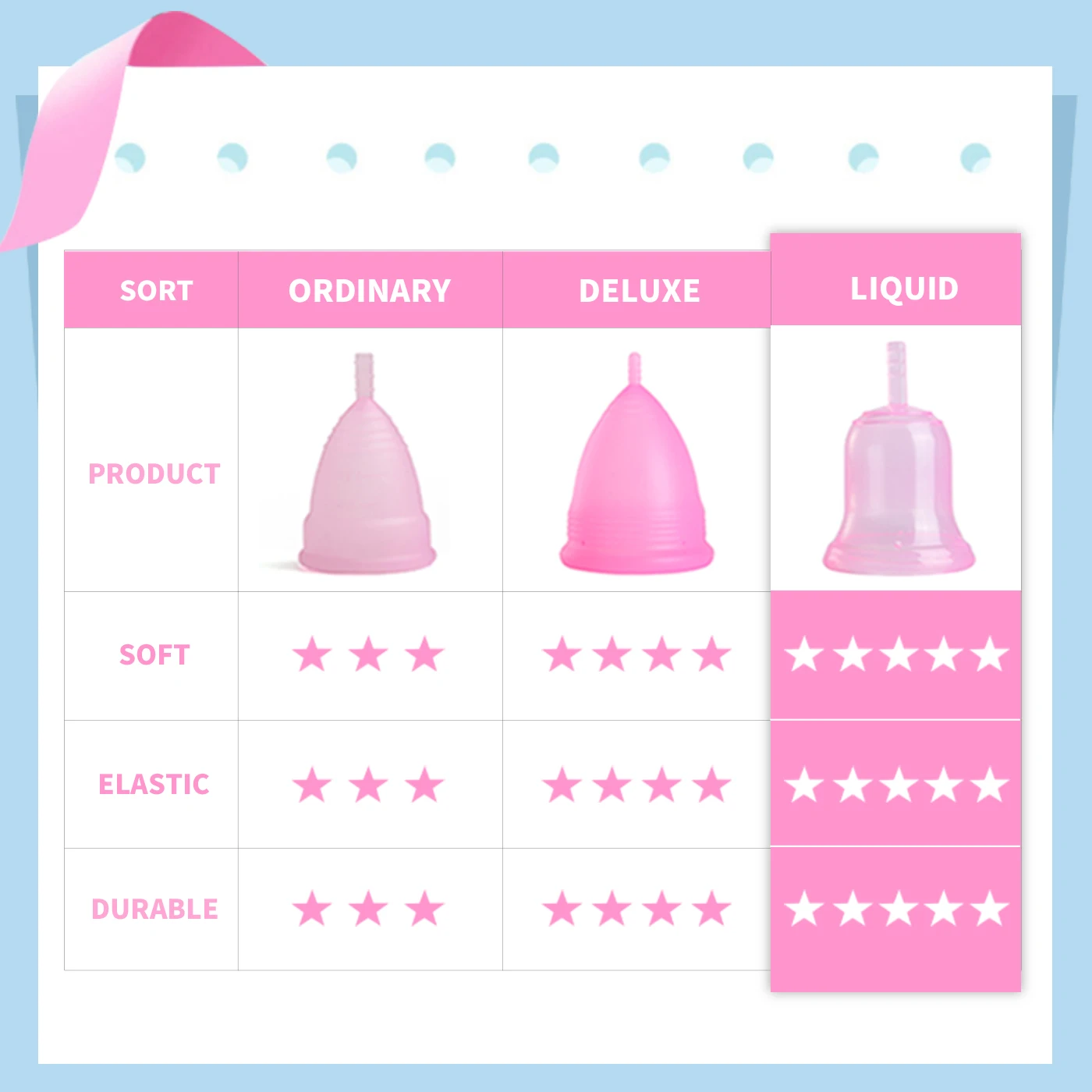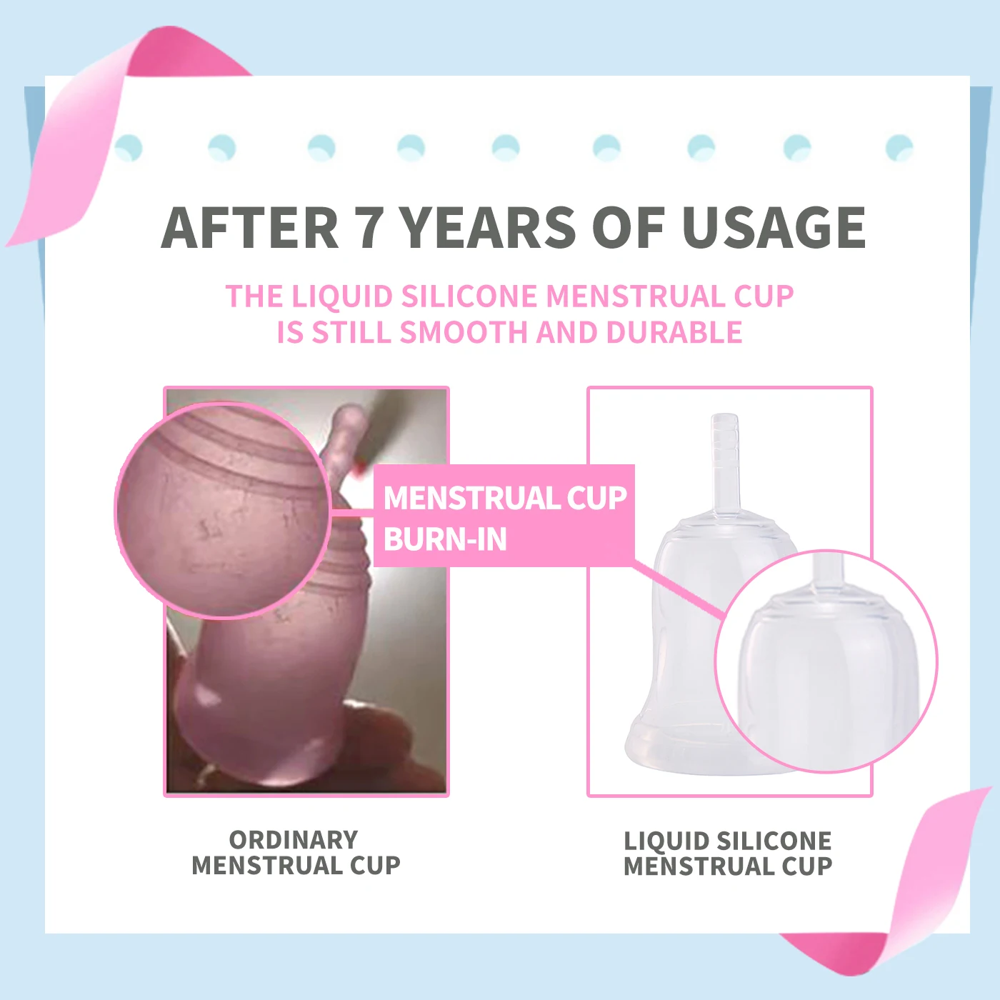 1. Медицинский сорт силиконовой менструальной чашки, применение 43,5 градусовМEdical жидкий силиконМягкие и эластичные, без деформации после 24 часов использования.
