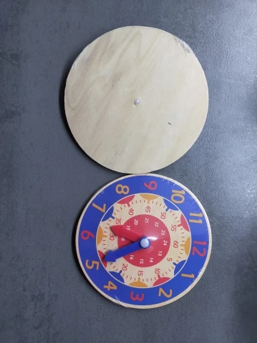 На тонкой фанерке, стрелки пластмассовые, все цифры четкие. Общий размер довольно маленький, как блюдце. Все цифры на месте. Изучать по ним время можно.