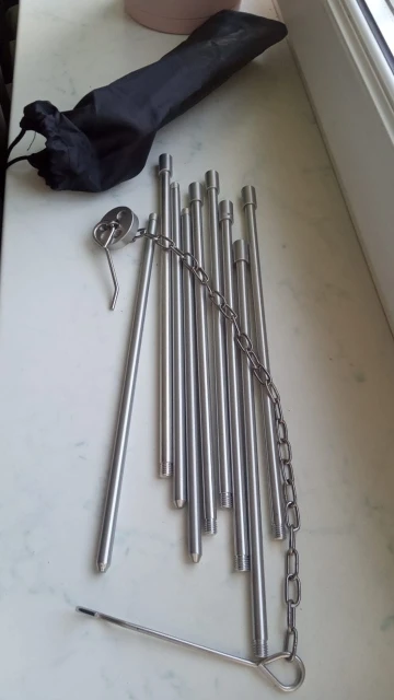 Из-за своего маленького размера эта тренога не для костра, а для горелки. Конструкция довольно хлипкая - сильно шатается по причине недостаточной жесткости. Довольно просто изготовлена из алюминиевых прутков Д8. Можно и самому такую сделать - получится дешевле и не хуже. Планирую изготовить и добавить еще одно или два звена, чтобы было пригодно для костра. Доставка быстрая, курьером