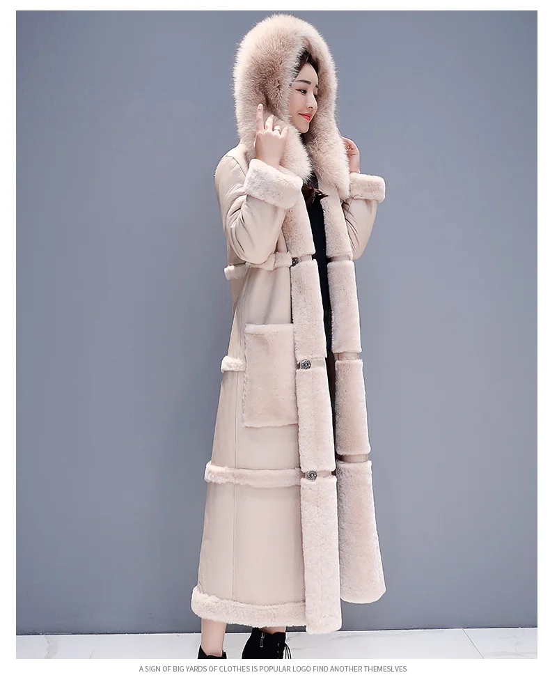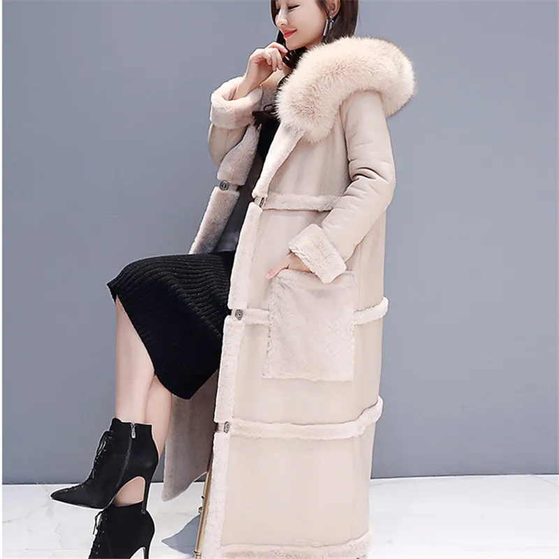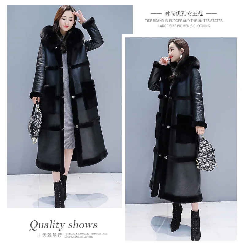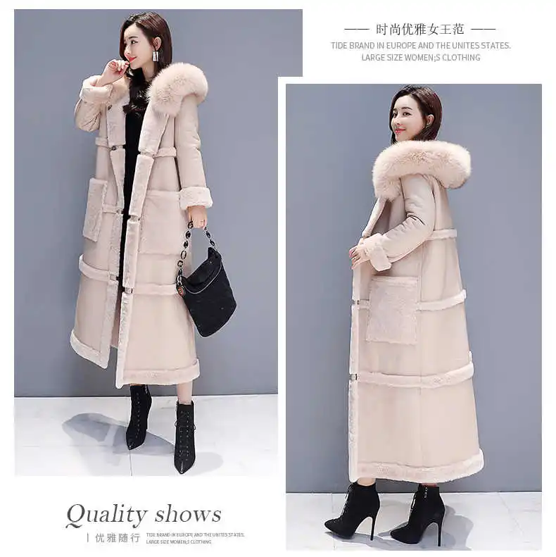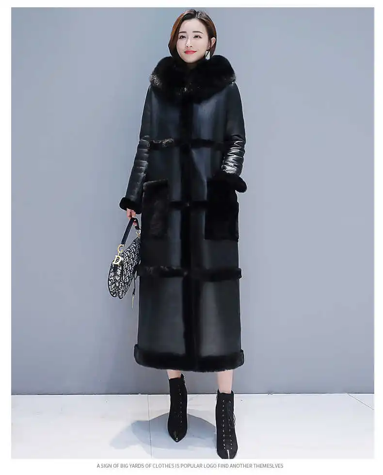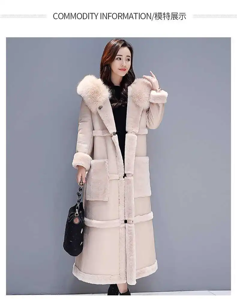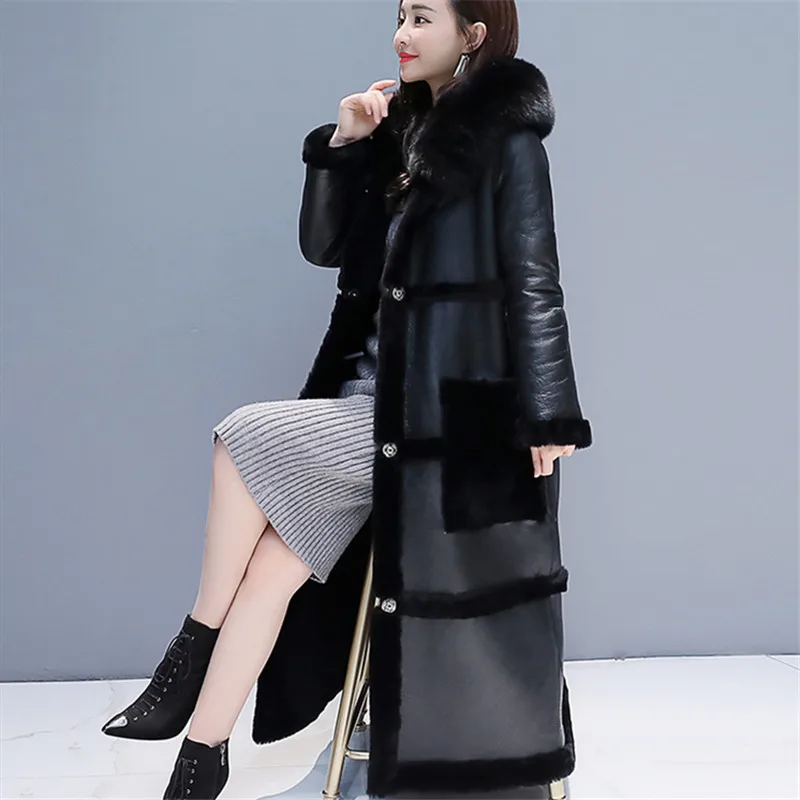 Осенне-зимнее пальто из овечьего меха для женщин, большие размеры, Свободный корейский большой меховой воротник с капюшоном, длинная толстая теплая куртка из искусственной кожи, пальто для женщин