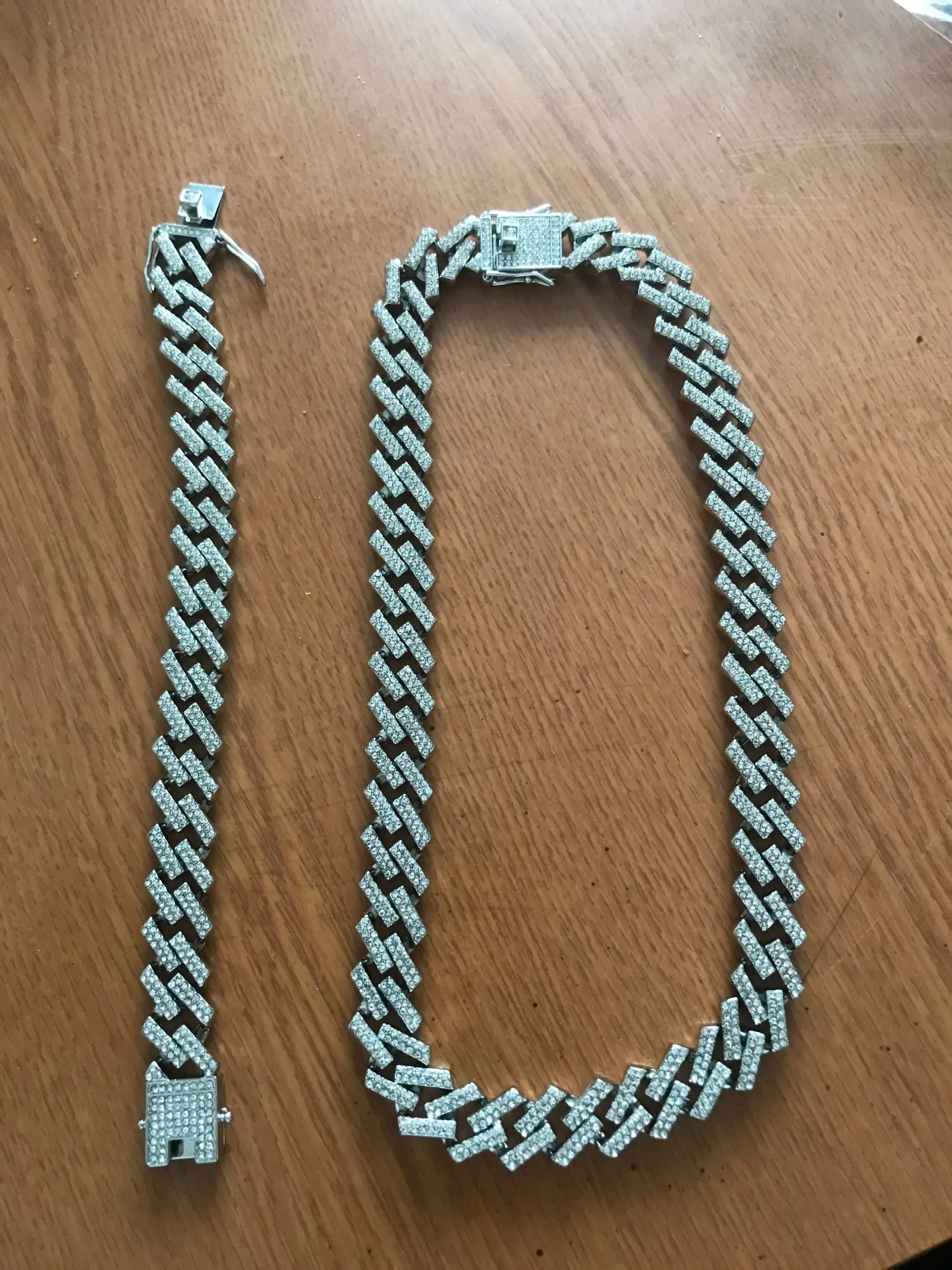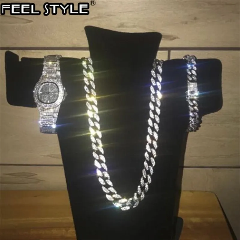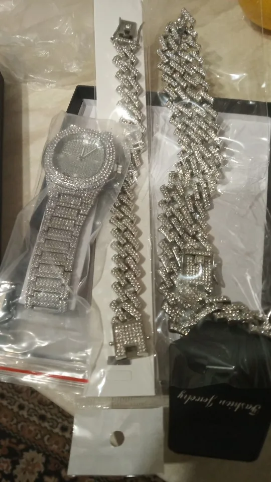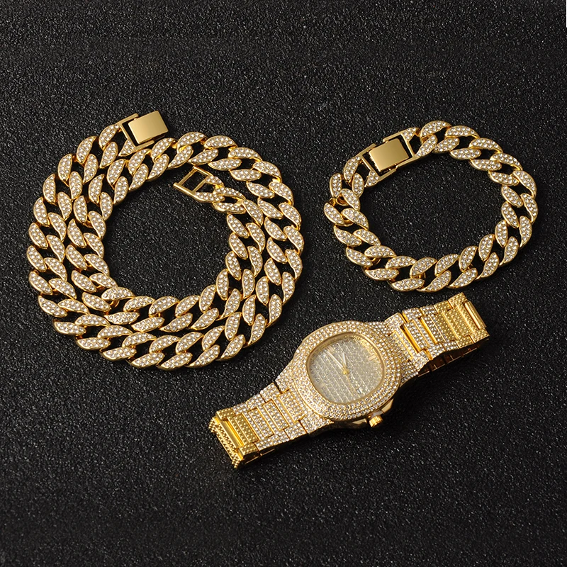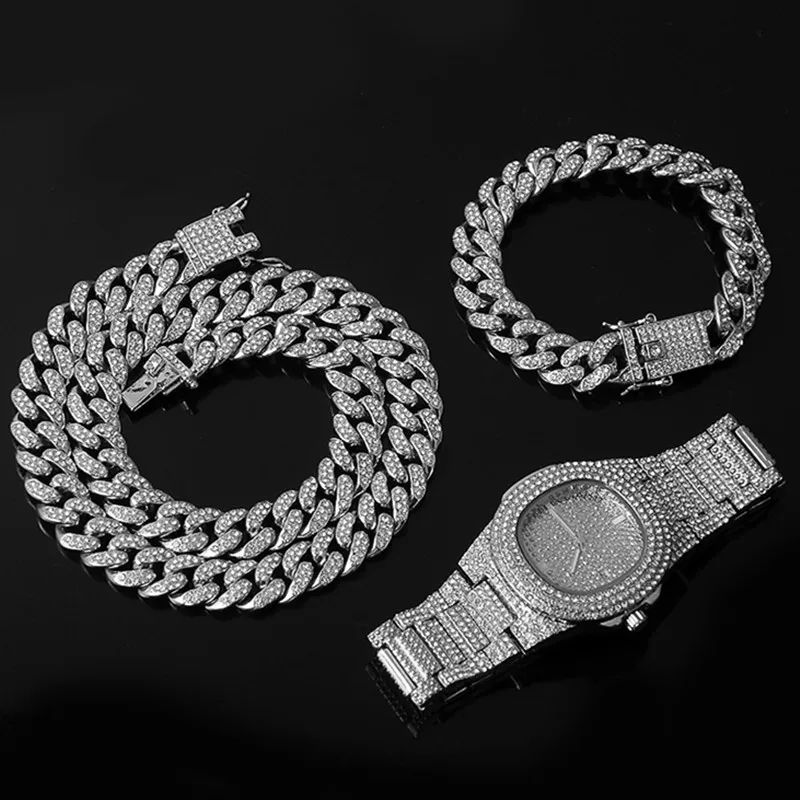 Цепочка мужская, серебристого цвета, ожерелье + часы + браслет в стиле хип-хоп, Майами, панцирное плетение, стразы