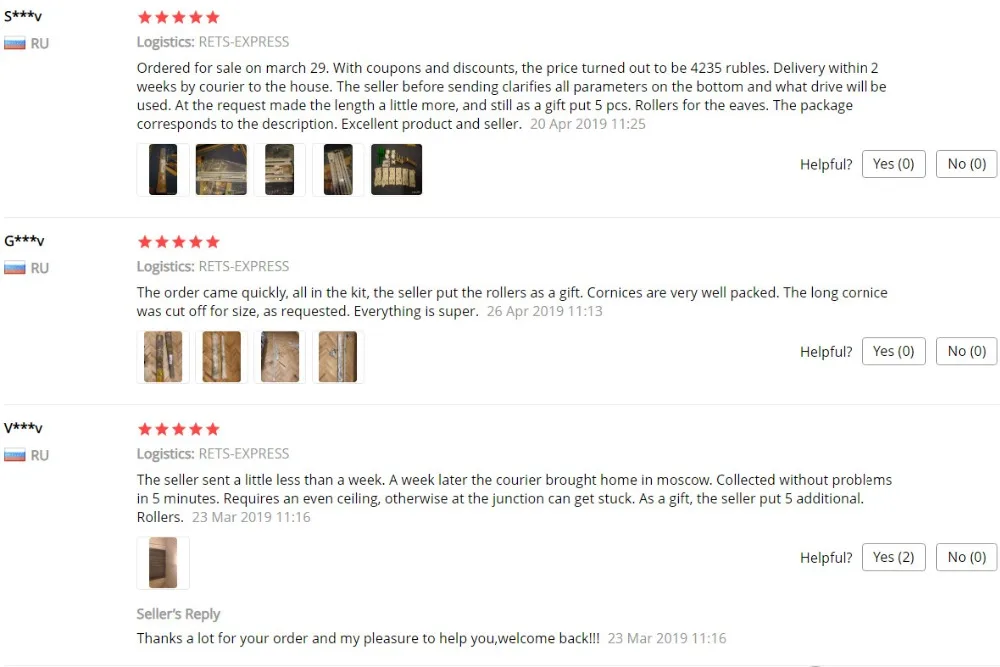 Все отлично, заказ пришел, вот только продавец заставил поволноваться, т.к. отправил мелким пакетом 5 роликов для штор и в систему загрузил отслеживание этого мелкого пакета. Карнизы шли другой отправкой и не отлёживались на сайте али. Вообщем думал что продавец кинул, а нет все норм, карнизы приехали.