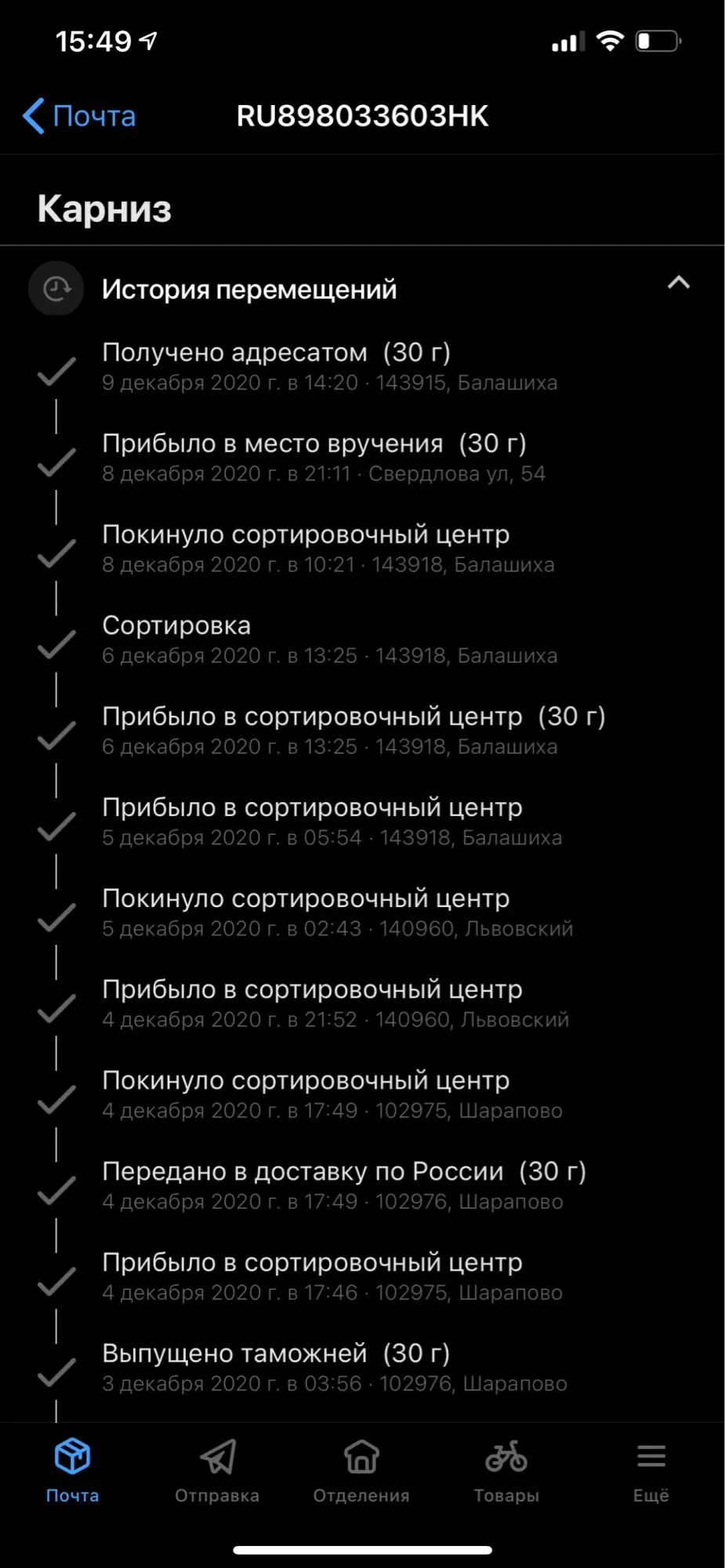 Пришёл изначально мелкий пакет с креплениями. Сам карниз был отправлен другой доставкой. Когда вышел срок страховки, а на руках был только мелкий пакет, то забеспокоился, даже открыл спор. Продавец попросил закрыть и показал, что товар давно в пути. Через неделю после этого всё доставили.