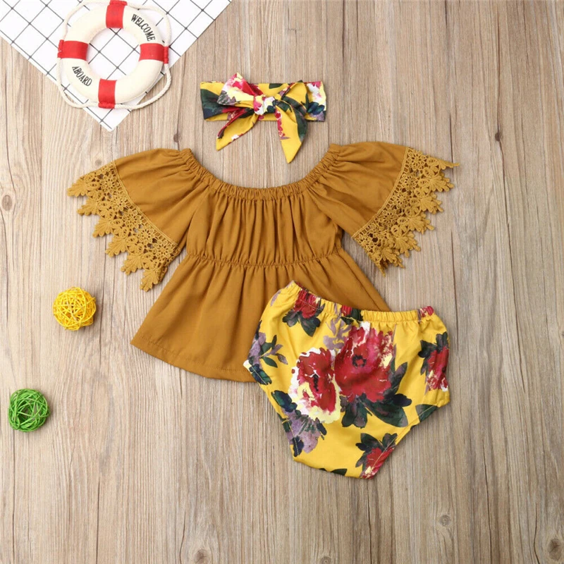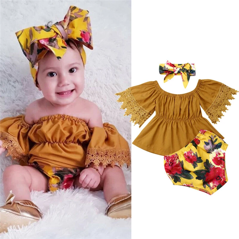 Новинка 2019, однотонные топы для маленьких девочек, От 1 до 5 лет Одежда для новорожденных детей, одежда для маленьких девочек, футболка + шорты с цветочным принтом, комплект из 3 предметов