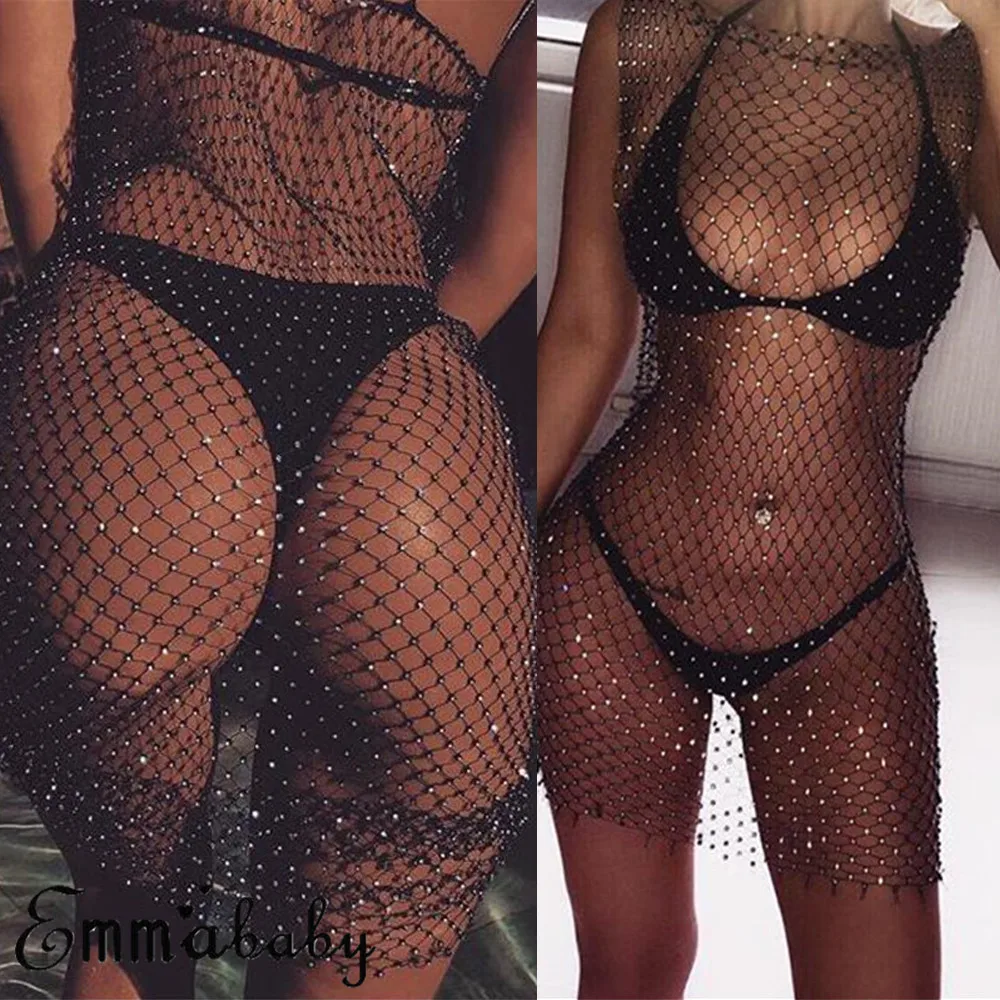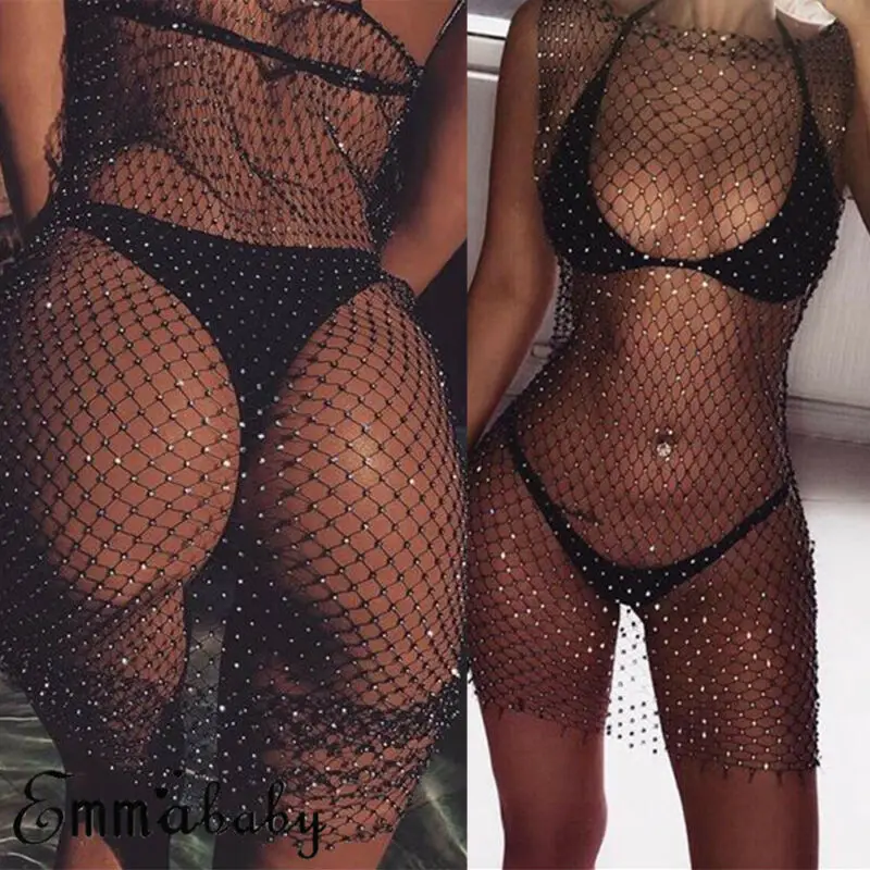 Женское бикини с блестками, накидка с кристаллами, топы, сексуальная ажурная сетка, прозрачный купальник, одежда для плавания, топы, платье, черный, белый