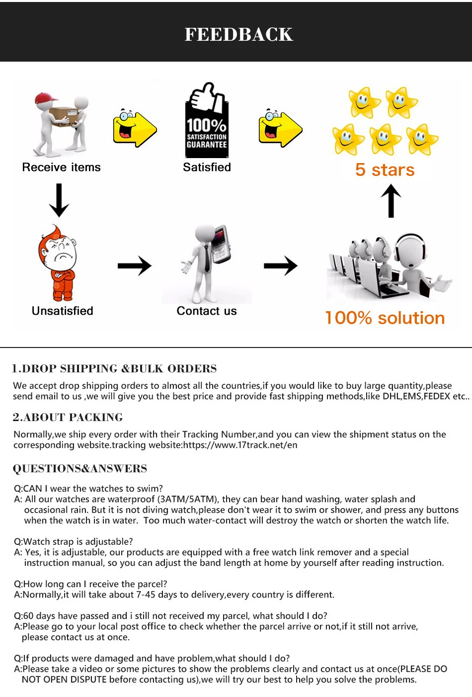 1) после оплаты мы отправим товар в первый раз. 2) Мы обеспечиваем прямую доставку, посылка без счета-фактуры; 3) методы доставки: (можно отправить ePacket или другой вариант быстрее) 4) Время доставки: почтовую службу «e-packet», которая работает: 7-25 дней; AliExpress Стандартный доставки: 15-60 дней 5) Если вы дальний клиент или оптовый клиент, вы можете связаться со мной перед покупкой, Цена может быть согласована. 6) Если у вас есть какие-либо вопросы по заказу, пожалуйста, свяжитесь с нами, и мы предоставим вам специализированную клиентскую службу, чтобы решить эту проблему.