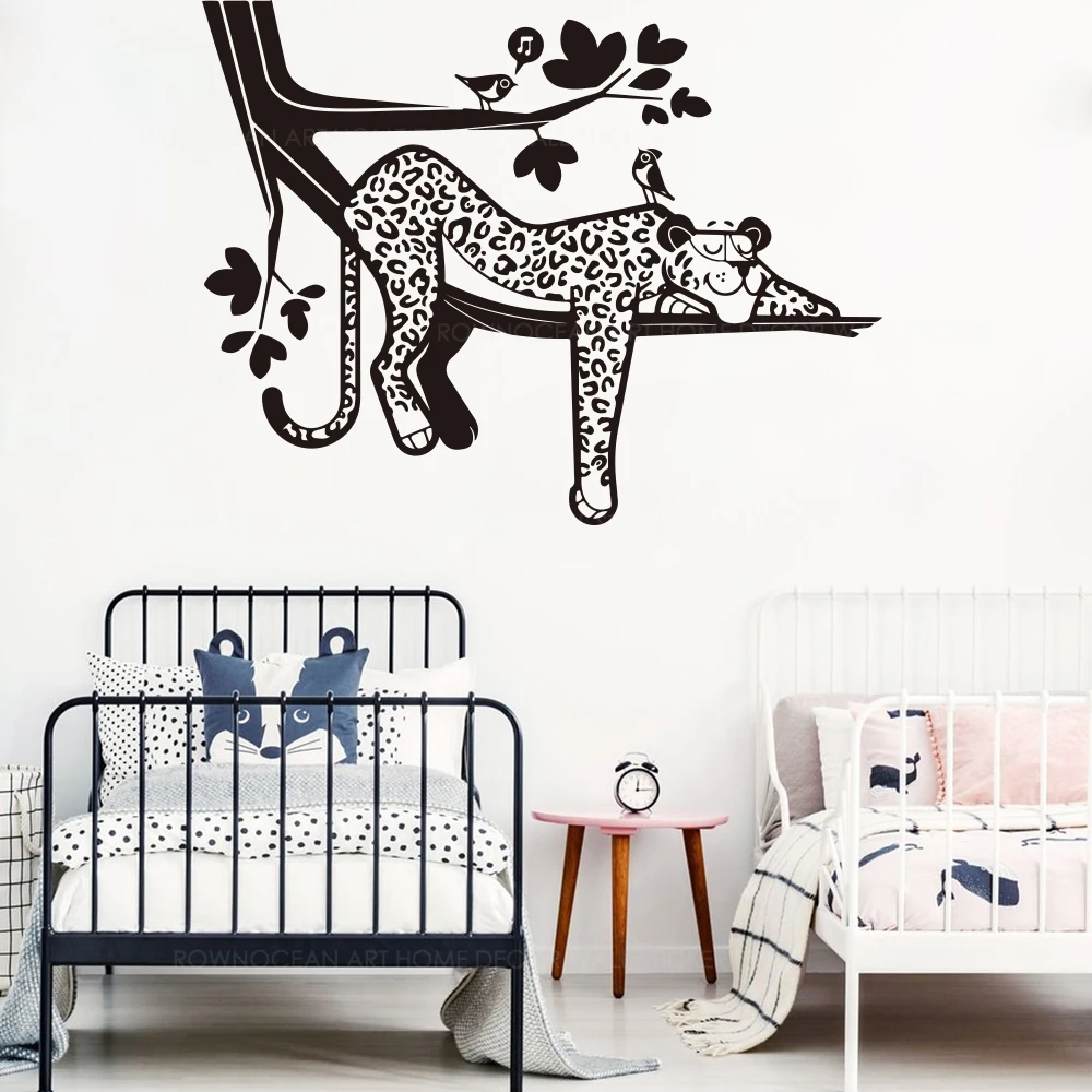 Мультфильм сонный ленивый Леопард Наклейка на стену сафари дерево лес джунгли висит леопард животное Ветка Птица Виниловая наклейка для спальни Z364