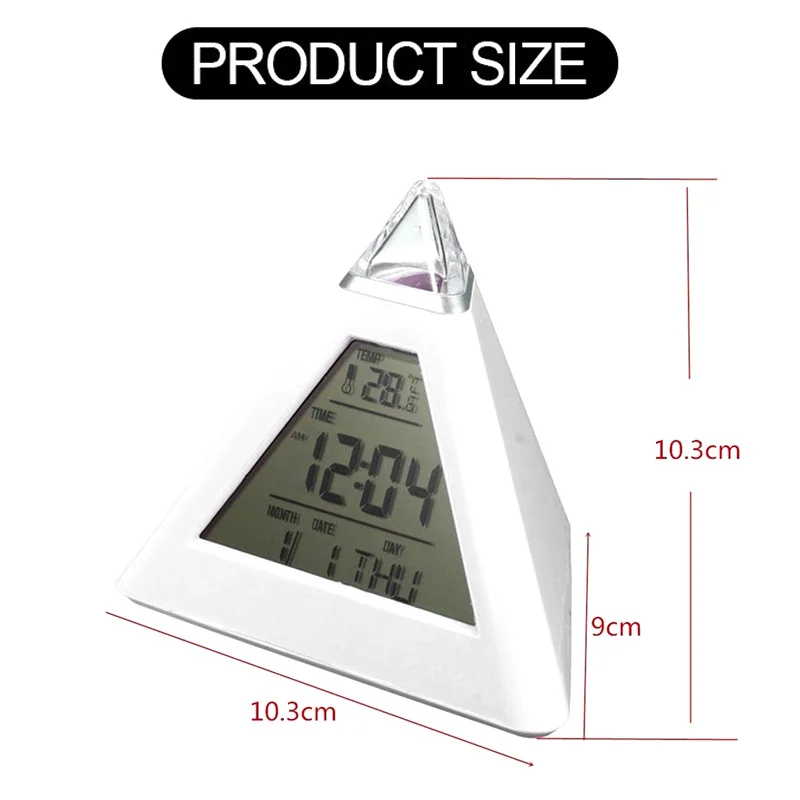 Технические характеристики: Название продукта: будильник с пирамидой Материал: АБС + электронный компонент Цвет: белый Размеры: прибл. 10.3x10.3x 9 см/4,05 "x 4,05" x 3,54" Дисплей Тип: Цифровой Форма: Треугольники Светильник Цвет: Цвет Фул Батарея: 3 батареи xAAA (батарея должна быть автономная) Особенности: 100% новые и высококачественные. Светодиодный Будильник с изменением цвета пирамиды. Яркая подсветка, ослепительная и подвижная, форма пирамиды, новый шик. Время, температура, дата, таймер, будильник последовательно отображается. Функция обратного отсчета, запуск времени обратного отсчета 60 минут, 0 секунд, обратный отсчет был остановлен. Выбор формата 12/24 часов. Музыкальная сигнализация и режим повтора, вы можете установить ежедневное время будильника, вы также можете выбрать различное музыкальное сопровождение, вы можете установить интервал повтора, чтобы продлить время. Температурный режим, автоматически определяет температуру окружающей среды может быть достигнуто по Цельсию и по Фаренгейту преобразования температуры. Посылка включает в себя: 1 x будильник пирамиды Примечание: 1. Допускается погрешность в 1-2 см из-за ручного измерения. Пожалуйста, убедитесь, что вы не возражаете, прежде чем сделать ставку. 2. В связи с разной конфигурацией разных мониторов изображение не отображает фактический цвет товара.