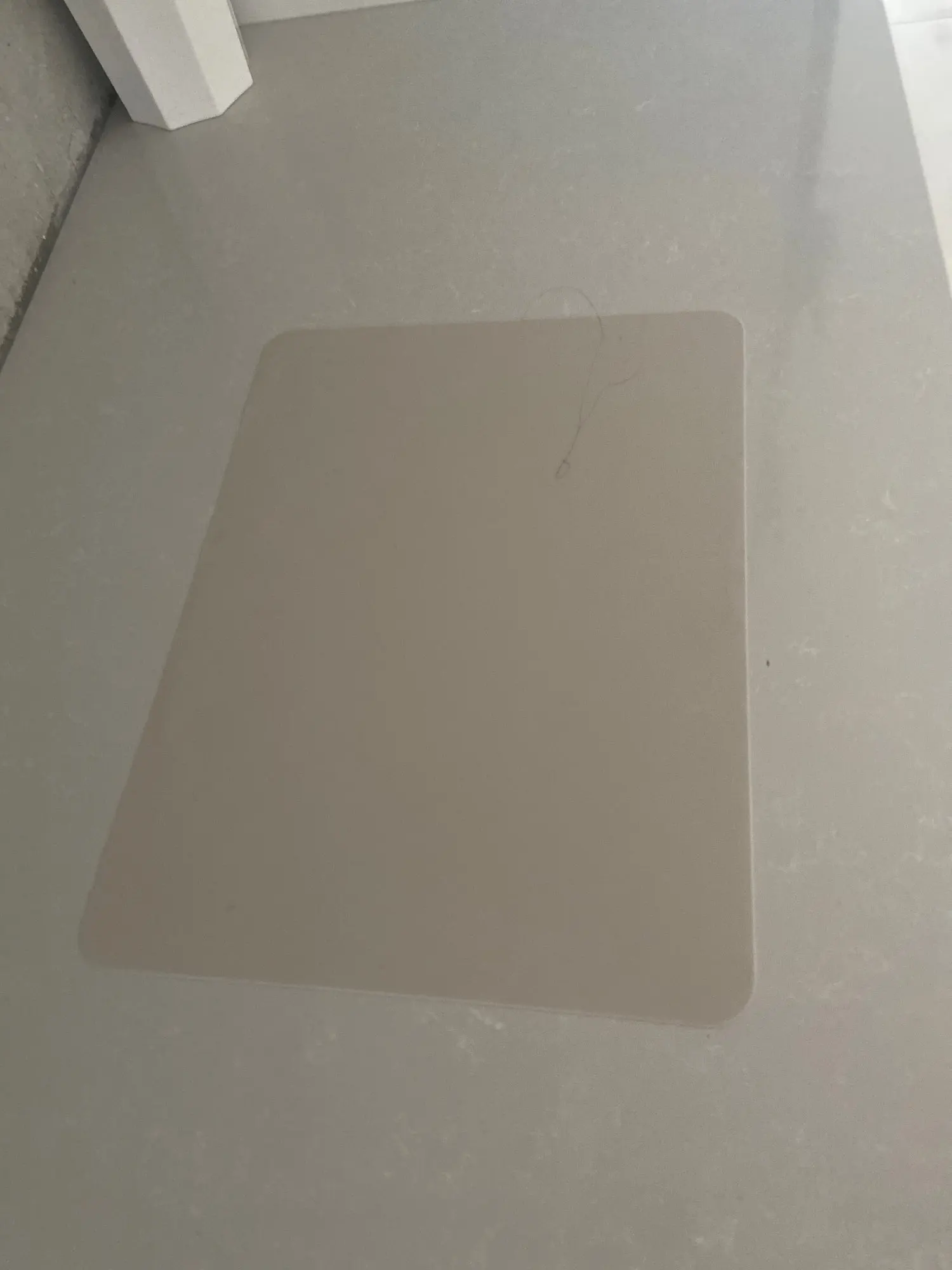 Коврик пришёл быстро. В целом и общем он очень хорош. Размерам соответствует. Но я, если честно, надеялась, что он будет более липкий, менее скользящий, а он такой шероховатый слегка, как будто тальком покрыт. Ощущение чего-то на поверхности. Заказывала, чтобы у кошки лапки не скользили по полу, когда она коготки точит о стоячую когтеточку, но он оказался даже более скользким, чем плитка на полу