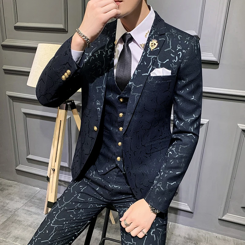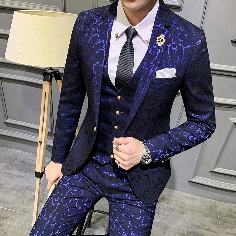 Блейзер + брюки + жилетмужской облегающий костюм из 3 предметов роскошный мужской костюм с принтом Королевского синего платья Тонкий смокинг мужской костюм Одежда для жениха