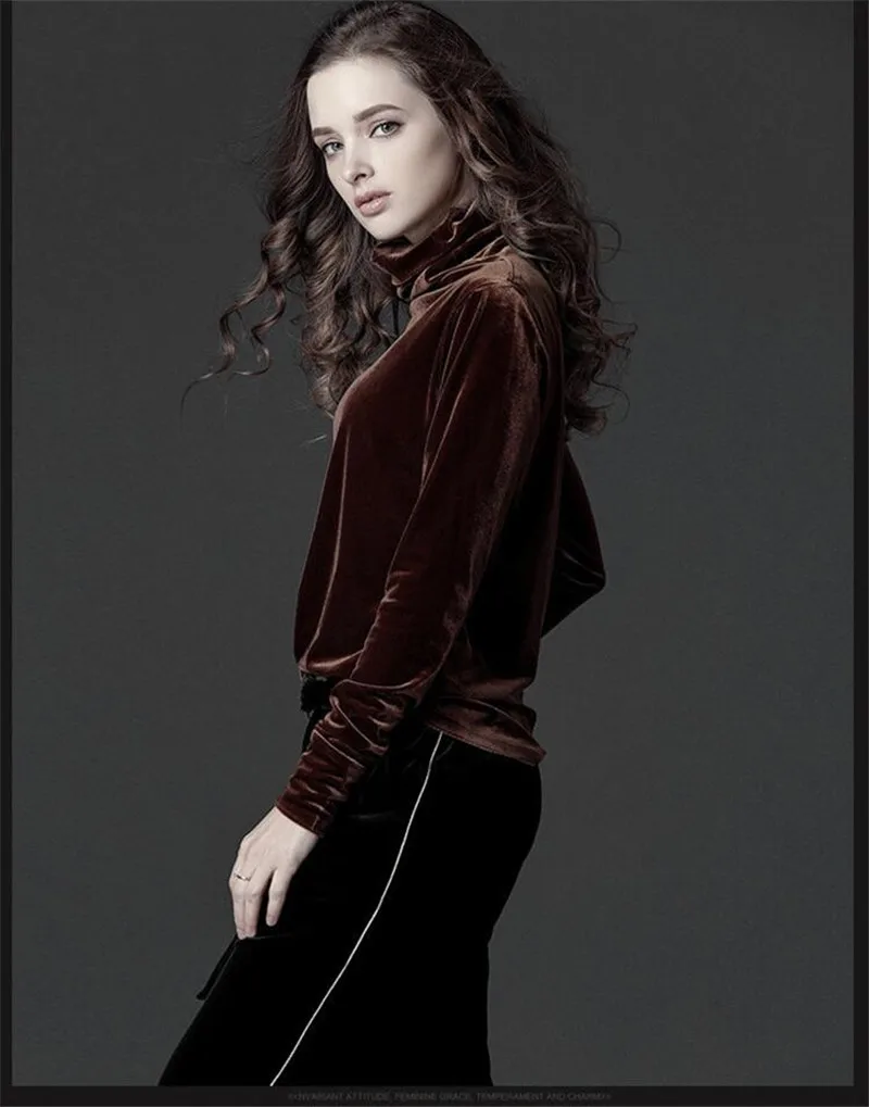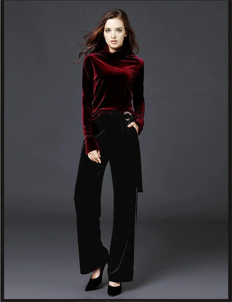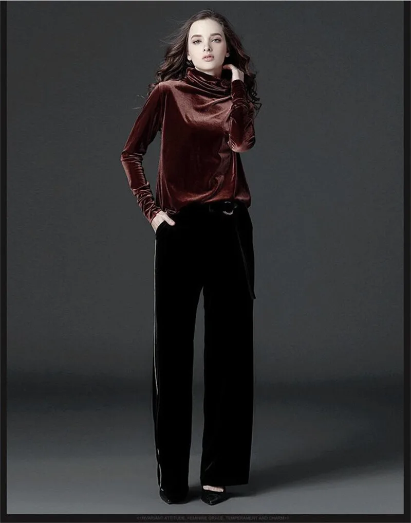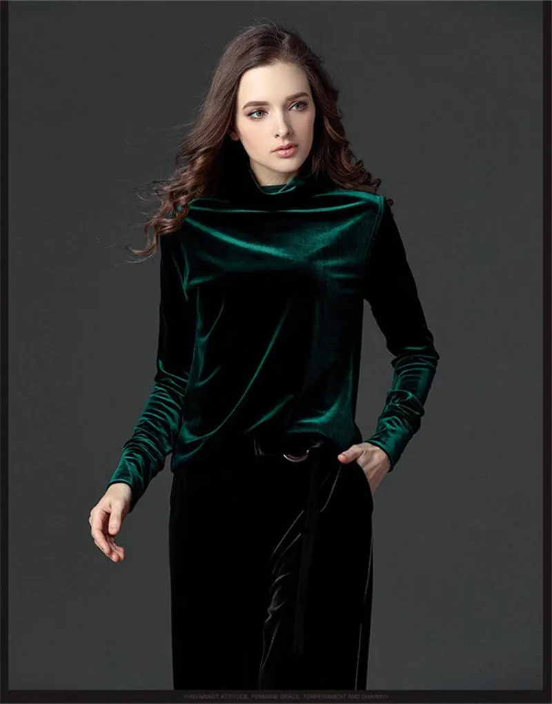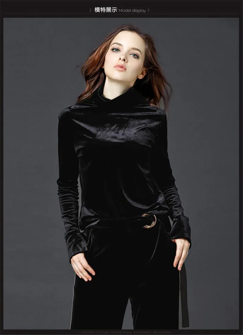 Женские осенние бархатные рубашки с длинным рукавом, однотонные топы с высоким воротником, удобные эластичные базовые футболки-