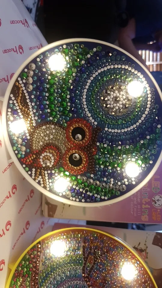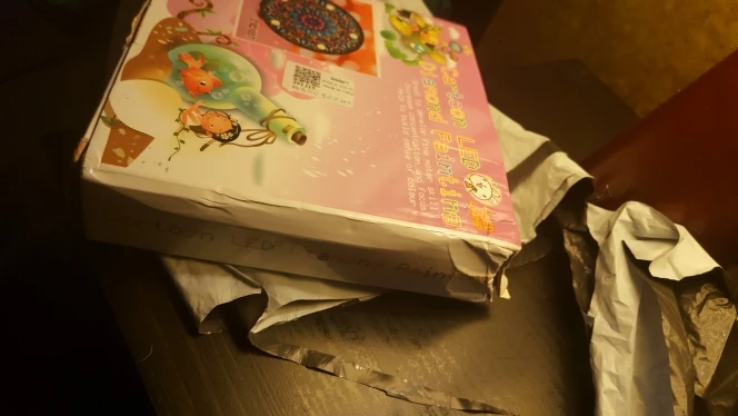 Товар упакован в коробку. Собрала алмазики за два часа. Ночник работает от двух пальчиковых батареек. Батарейки в комплект не входят. Общее впечатление: игрушка для детей, дорого... Не производит впечатления за эту стоимость. Доставка больше месяца. Пришли четыре разные посылки в одном мешке.