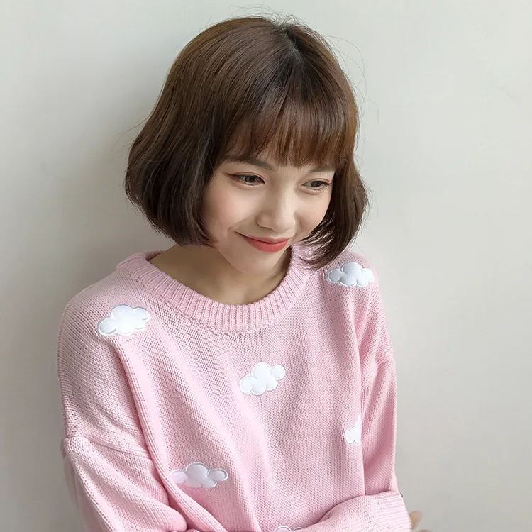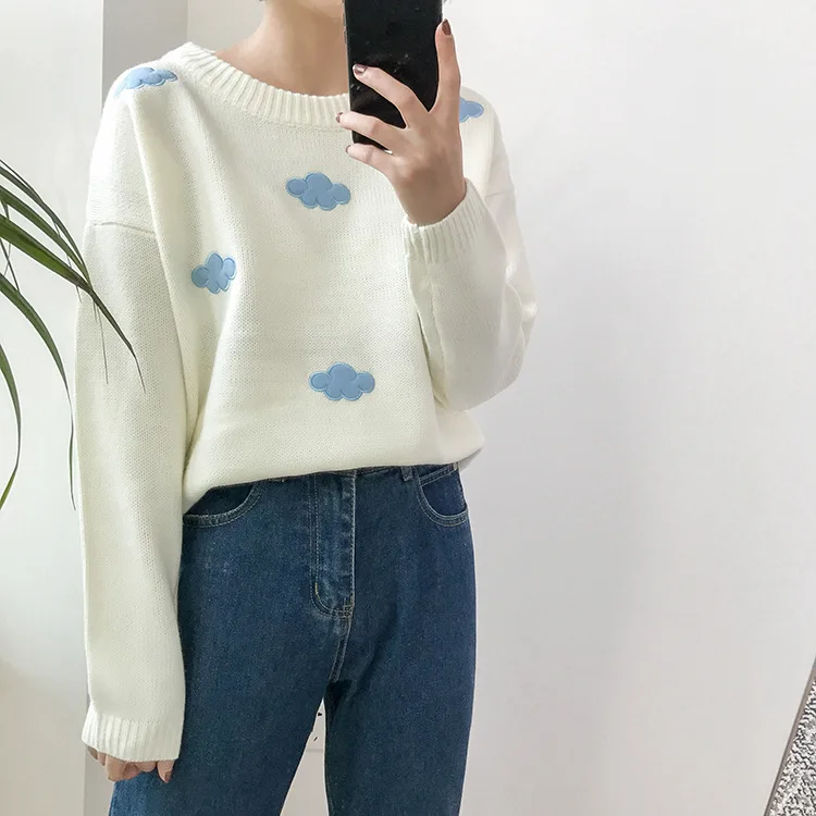 Весенний свободный розовый кавайный свитер с облаками, Женский пуловер, повседневный трикотажный свитер с круглым вырезом и длинным рукавом, женская зимняя одежда в Корейском стиле