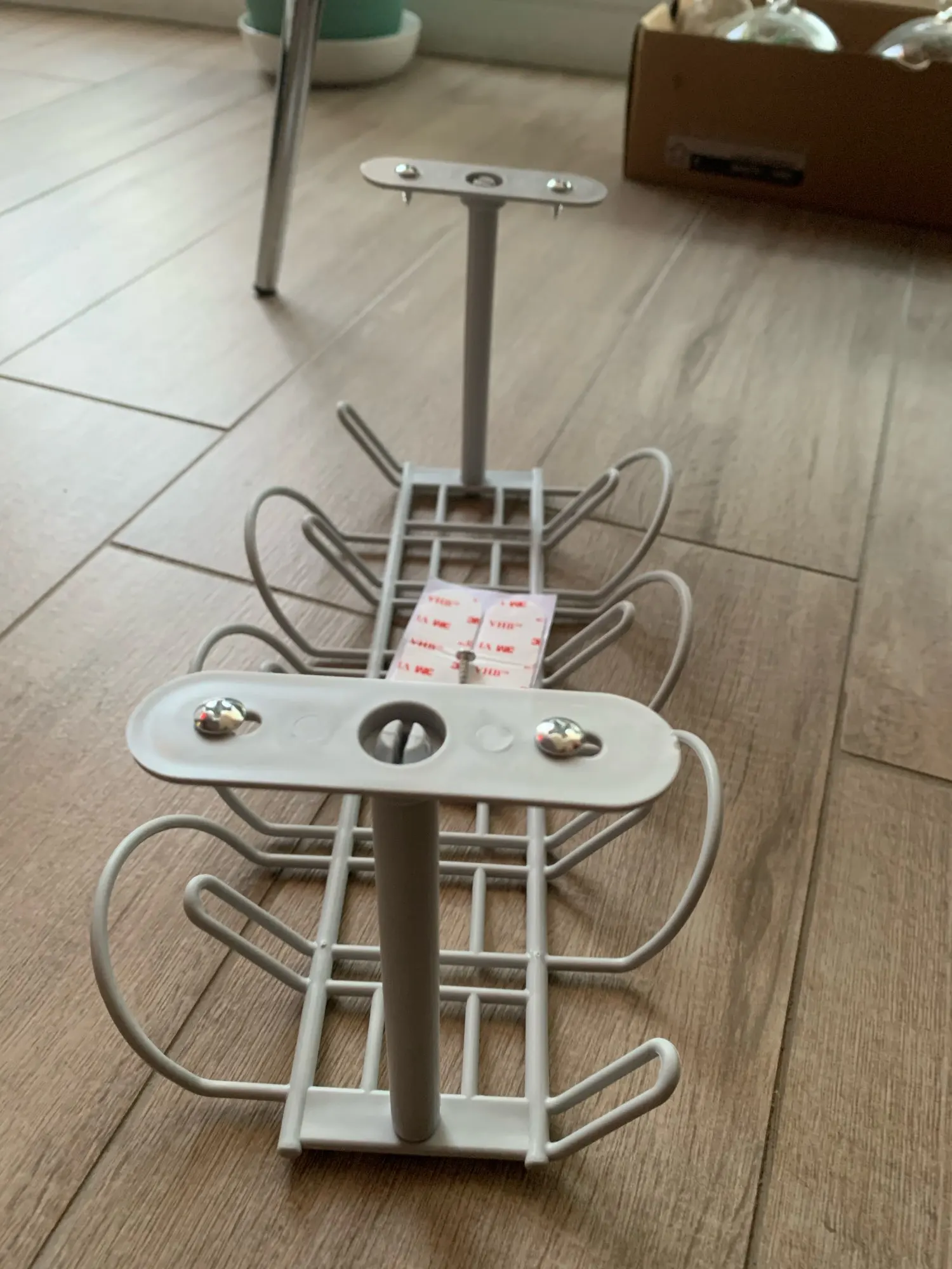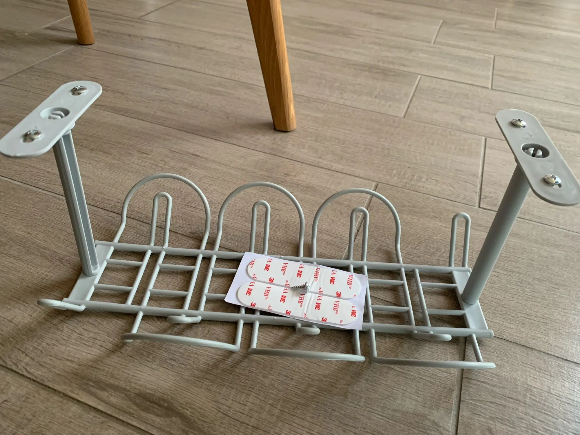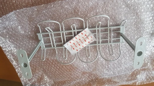 Быстрая доставка в Нидерланды (15 дней). Хороший продукт, поставляется с винтами и клейкой лентой для его установки. Я использовал оба для безопасности. Положите его под мой стол и хорошо работает. Он немного Согнут с весом, но держится