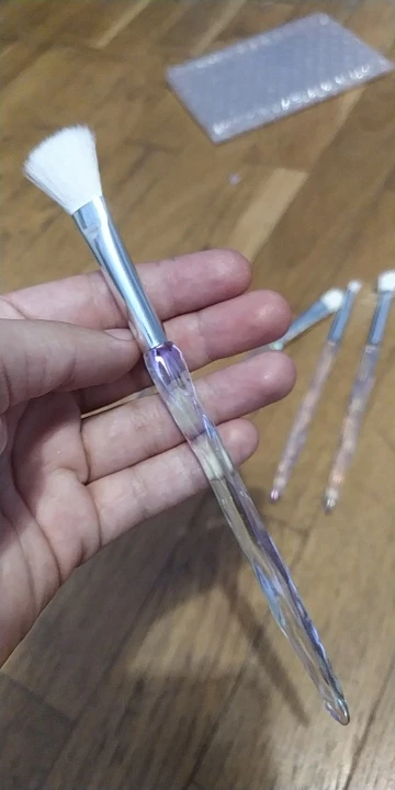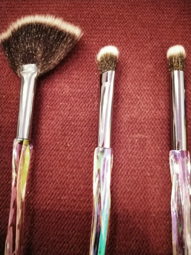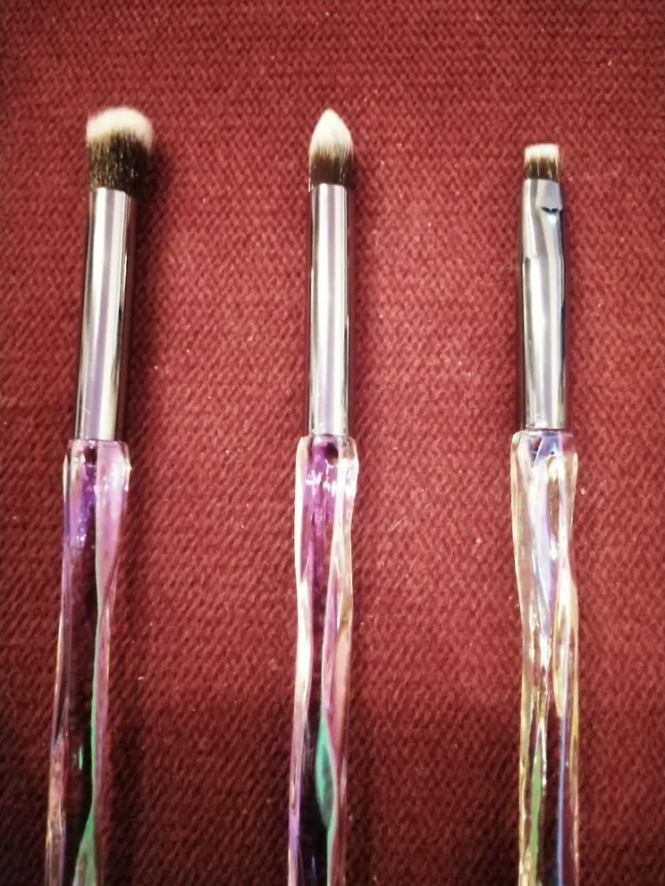 Хорошие кисти, 1-а немного помялась, но я уверена что расправится. Не "лысеют", хорошо набирают материал на ворс. Ничем не пахнут, упакованы хорошо.