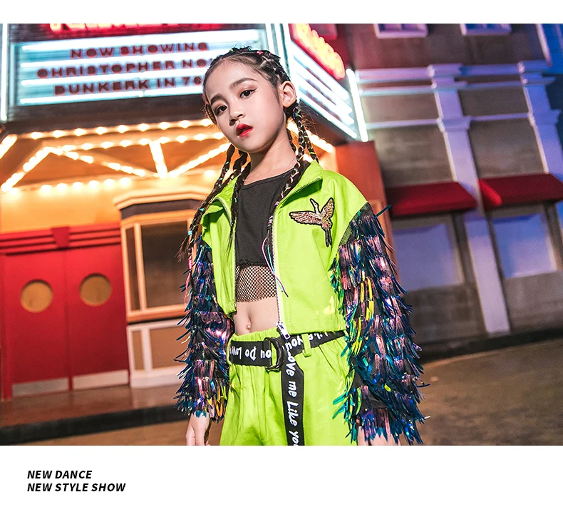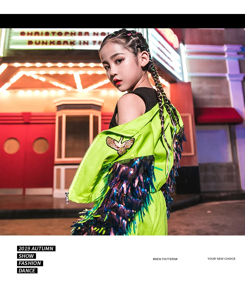 Танцевальные костюмы в стиле хип-хоп, ФЛУОРЕСЦЕНТНОЕ зеленое пальто с кисточками, джазовая Одежда для девочек, детская одежда для уличных танцев и представлений DN4099