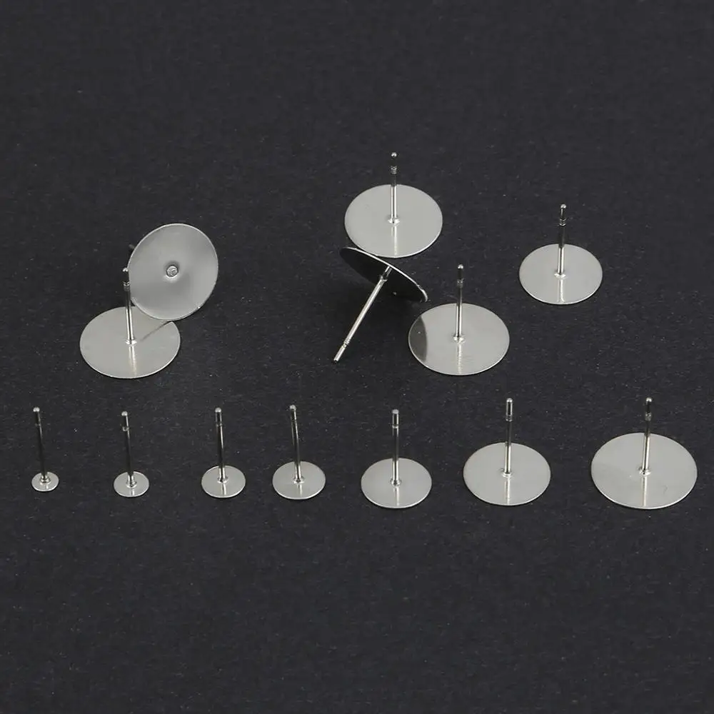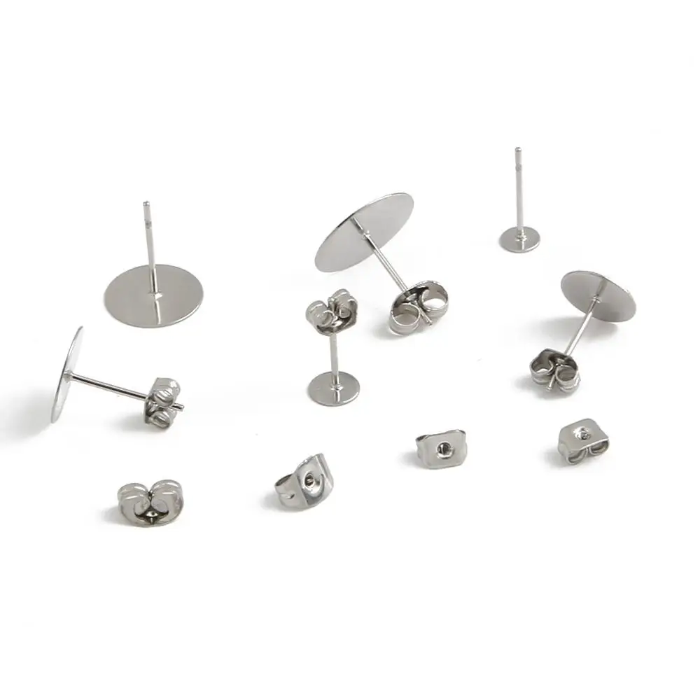 Плоские серьги-пусеты из нержавеющей стали серебристого цвета, 100 шт.лот, шпильки для сережек с клеем 3-12 мм, основа для сережек кабошона, аксессуары для ювелирных изделий