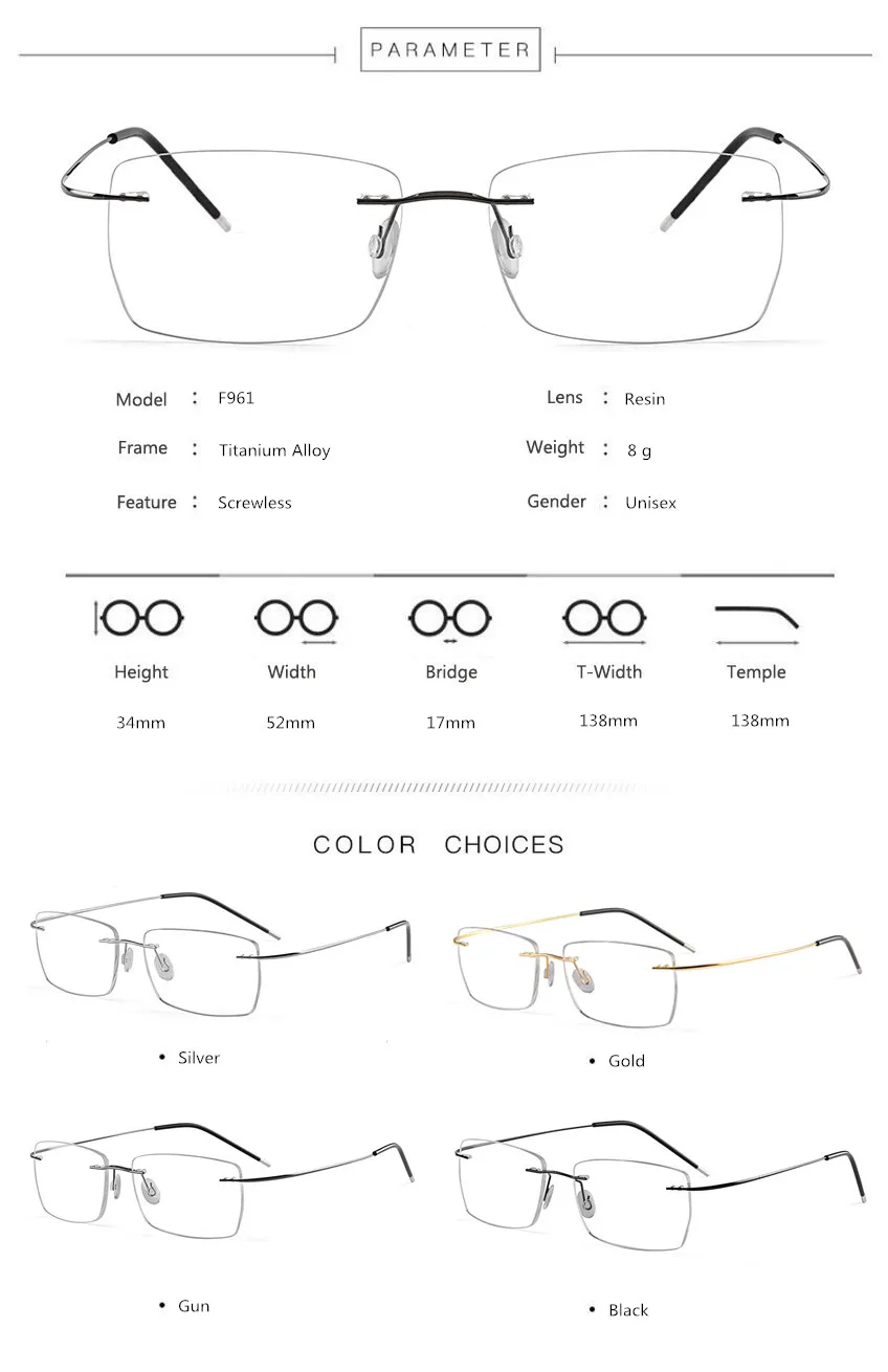 Мужская квадратная оправа для очков, из титана ультралегкие очки без оправы без винтов, по рецепту, для близорукости, F961