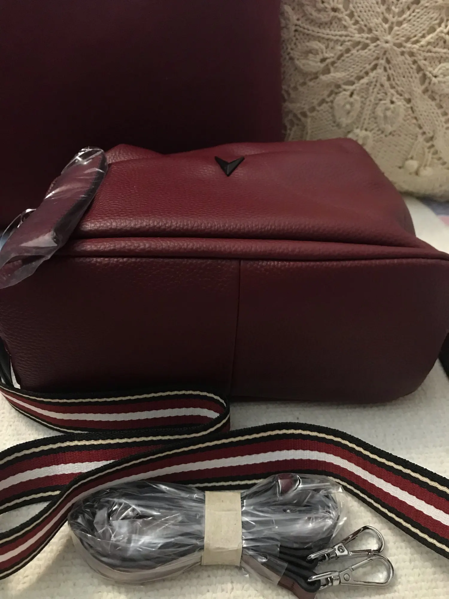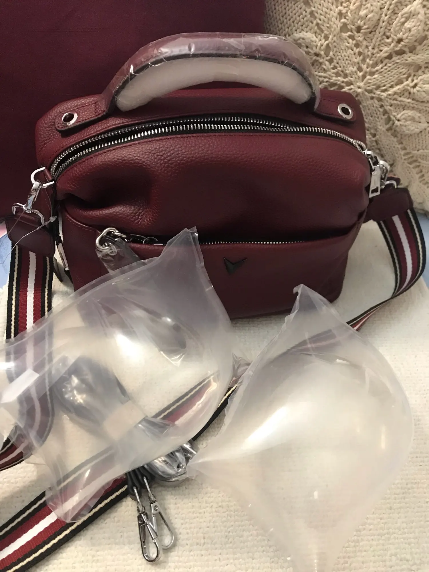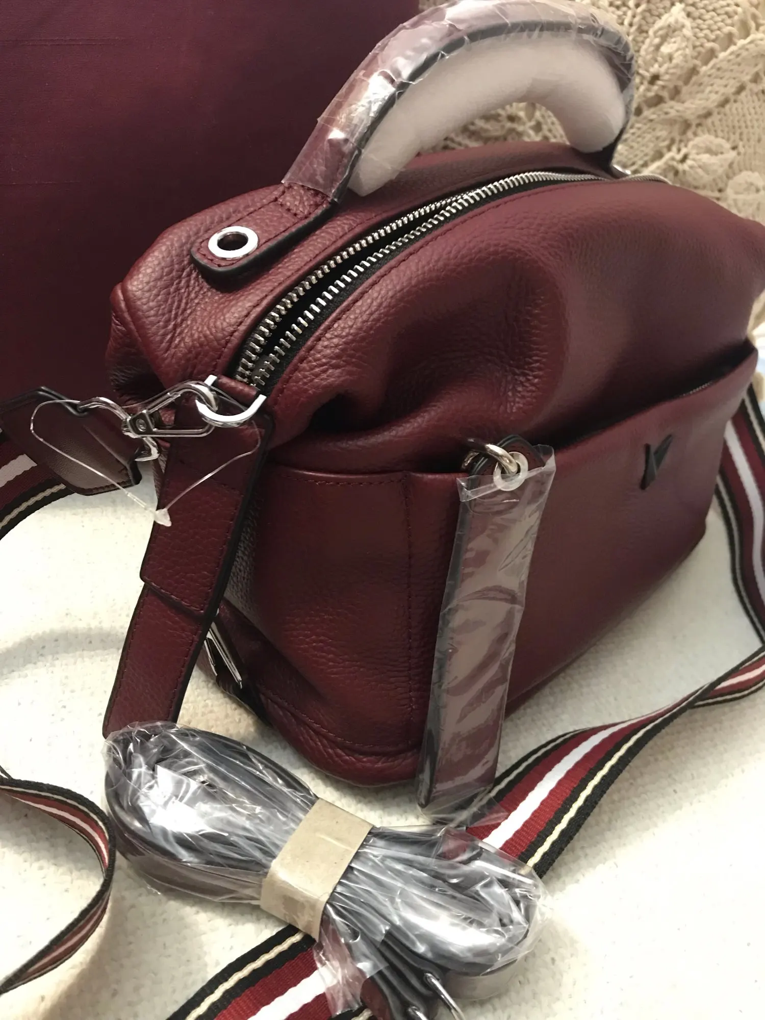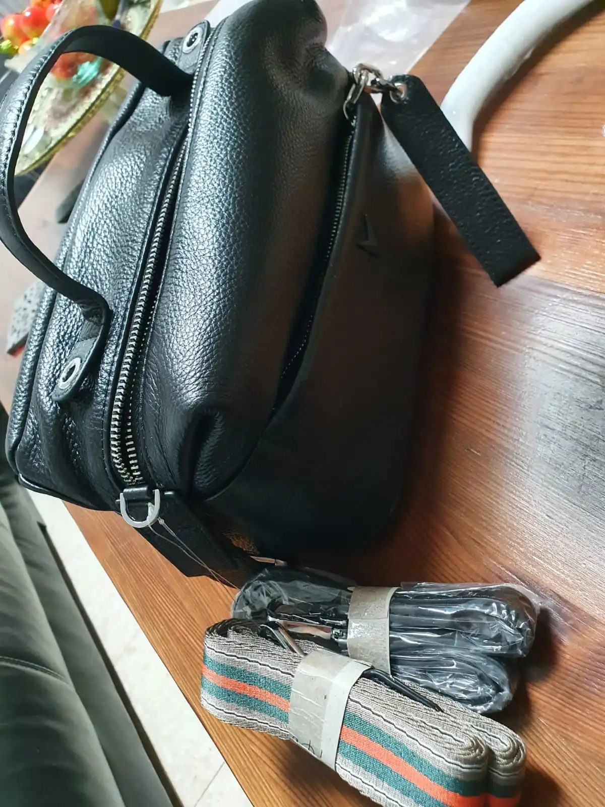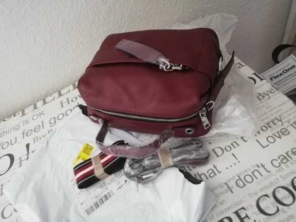 Доставка быстрая, трек отслеживался. Сумка упакована в 3пакета.каждая фурнитура в отдельной пленке. Но ремень тоненький и кажется не кожаный.внутри 2кармана,по бокам 2отделения на замке.с продавцом не общалась,отправил быстро.