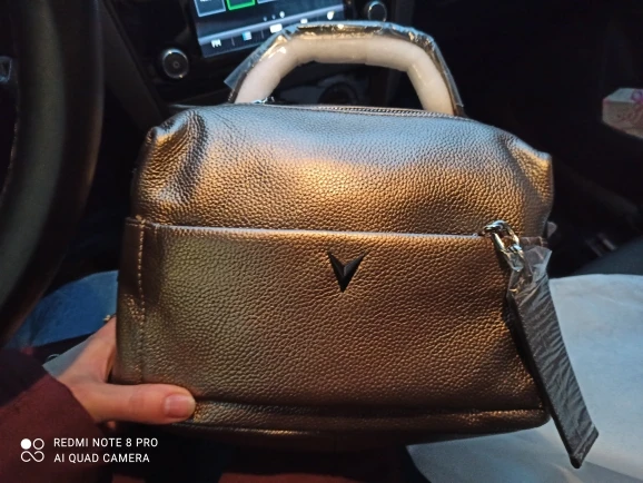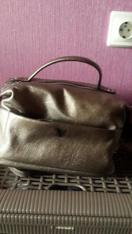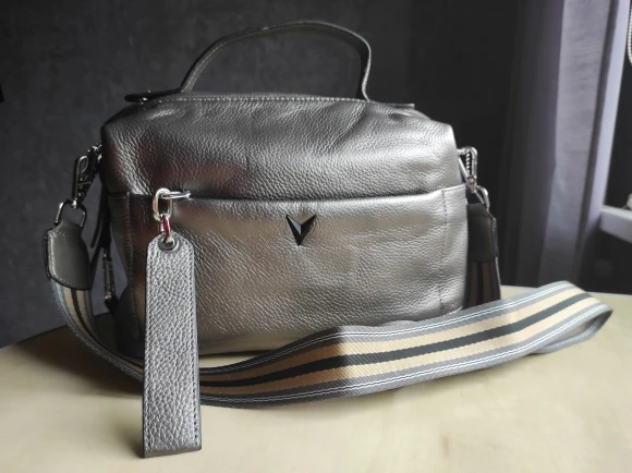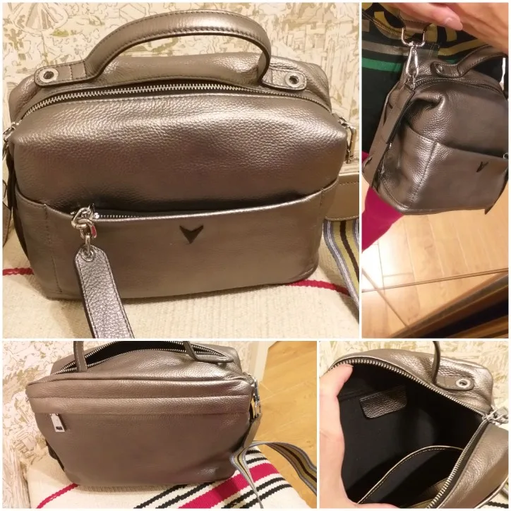 Хорошенькая сумка, небольшая, но вместительная с множеством отделений. Строчки все ровные, фурнитура металлическая. Цвет интересный. Не серебряный, коричневый, но не насыщенный, с золотым переливом. Упакована была отлично. Три пакета и воздушная подушка внутри. Продавцу большое спасибо.