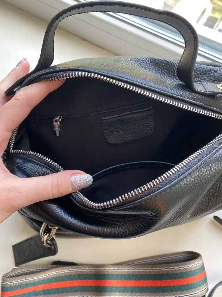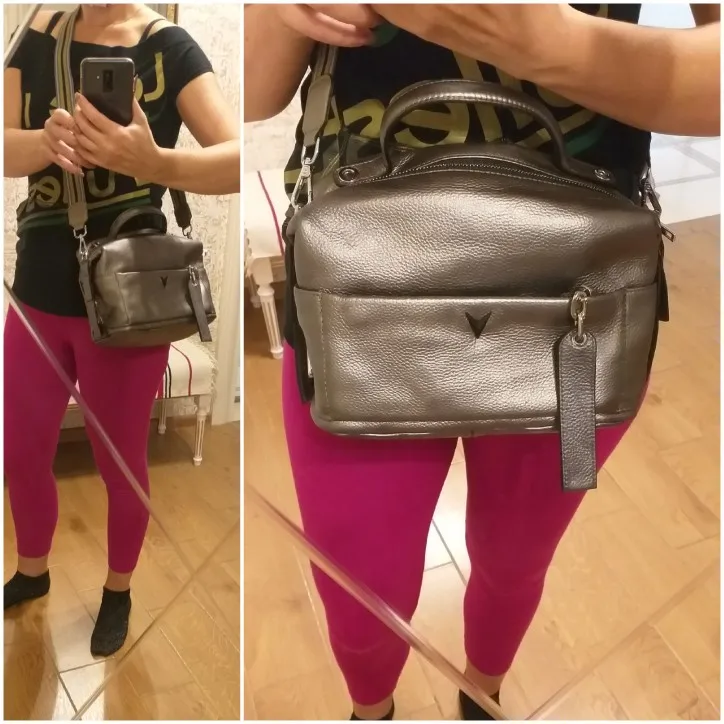 Сумка отличного качества - кожа, пошив, фурнитура - все на хорошем уровне! Немного коротковат ремешок для кроссбоди. Я проколола дырочку в конце ремешка - и стало нормально. Текстильный ремень тоже короткий. Только для ношения на плече. Но, в целом, отлично все! Спасибо продавцу.