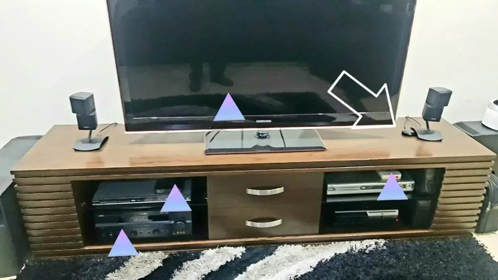 Вау, какой товар. Он настолько мощный, что даже не требует линии обзора, так как другие инфракрасные устройства нужны, например, обычные пульты дистанционного управления. Установка была легкой, но Удаленная компоновка не может быть изменена, что, по моему мнению, должно быть изменено. Функция обучения также очень полезна. Настоятельно рекомендуемый продукт. Вы можете увидеть на фотографиях, что он расположен над столом, и он общается с моим приемником Yamaha, Huawei STB, WD TV устройством и ТВ. (Эти устройства отмечены цветными треугольниками на фотографиях, и устройство отмечено белой стрелкой)