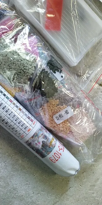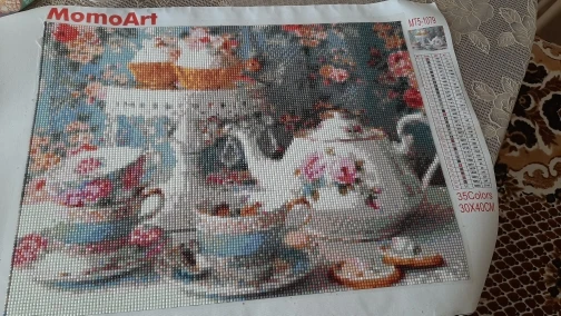 На первый взгляд всё в порядке, комплектация полная. Картина включает алмазы 35 цветов, цвета красивые. Покупала за монетки с доплатой. С продавцом не общалась.