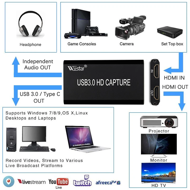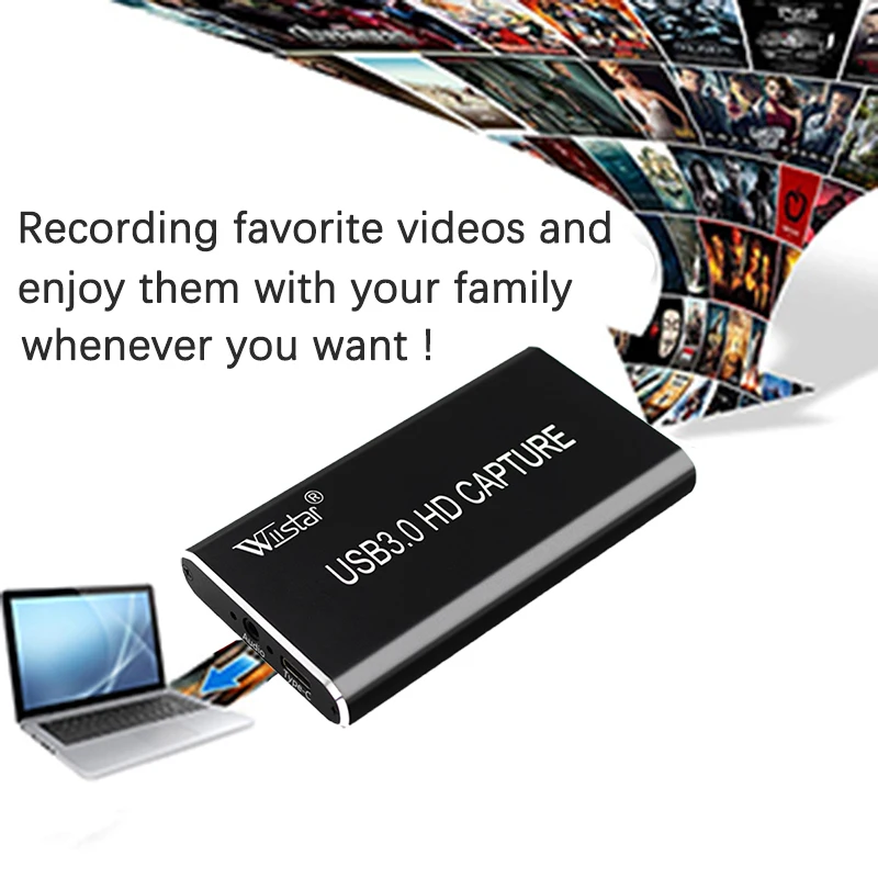 Этот видеосъемка Wiistar HDMI USB 3,0 поддерживает запись видео с сигнала HDMI на компьютер или ноутбук с интерфейсом USB3.0/Type C.