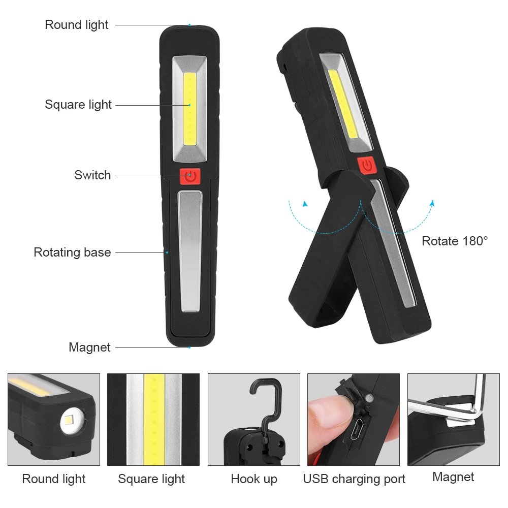 Портативный светодиодный светильник со вспышкой, встроенный аккумулятор USB, вращающийся на 360 градусов, рабочий светильник фонарь, поддерживающий COB светильник