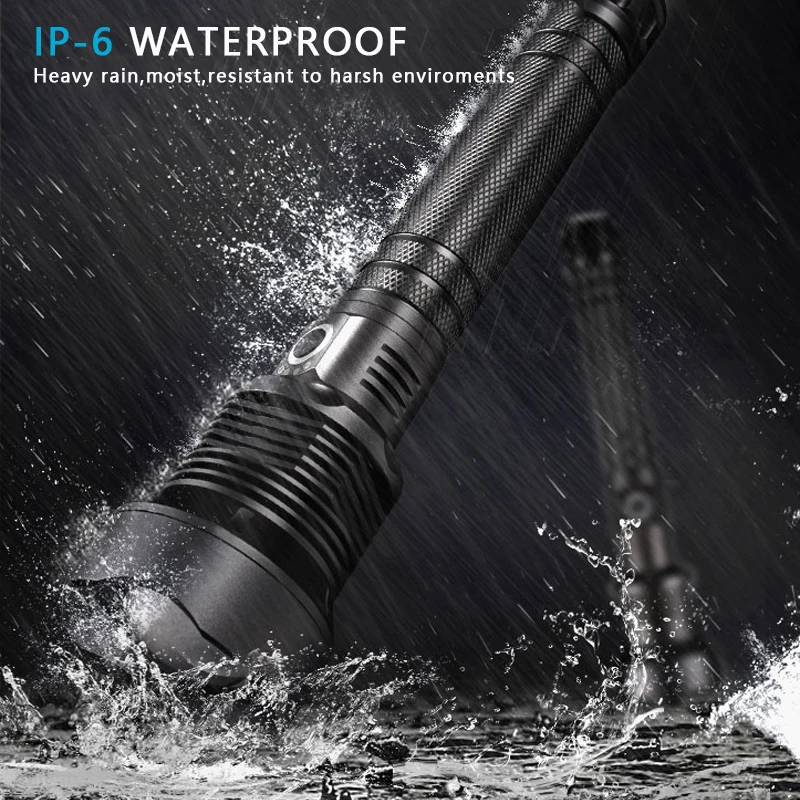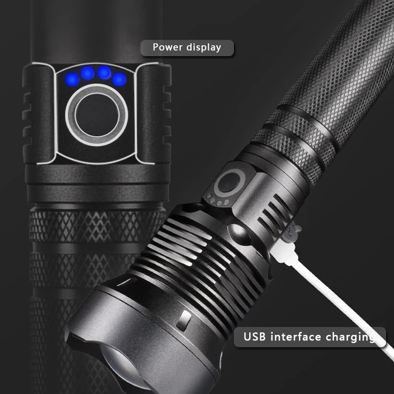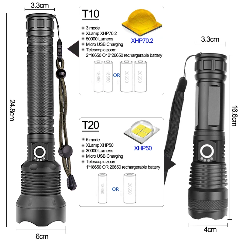 Мощный светодиодный фонарик с использованием XLamp XHP70.2 светодиодный фонарик с максимальным выходом до 50000 люменов Увеличьте 2*18650 или 2*26650 аккумуляторный отсек, чтобы увеличить время работы. Дисплей емкости аккумулятора, телескопический зум Микро-usb для компьютера usb, Автомобильный USB, usb-разъем для зарядки, зарядный фонарик Изготовлен из авиационного алюминиевого сплава прочный HAIII военный класс Жесткий анодированный Водонепроницаемый в соответствии с IPX-6, водостойкий, может использоваться в дождливую погоду, но не может положить его в воду Подходит для работы, охоты, альпинизма, рыбалки, кемпинга и активного отдыха и т. д. Ударопрочный до 2 метров
