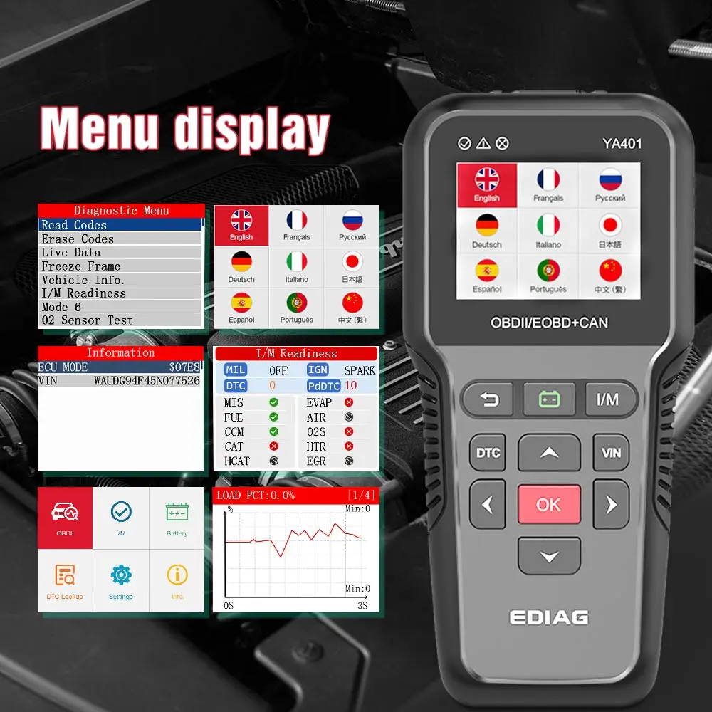 1. Многоязычный диагностический интерфейс:YA401 поддерживает 8 различных языков пользовательского интерфейса, включая английский, испанский, португальский, французский, русский, немецкий, японский, итальянский