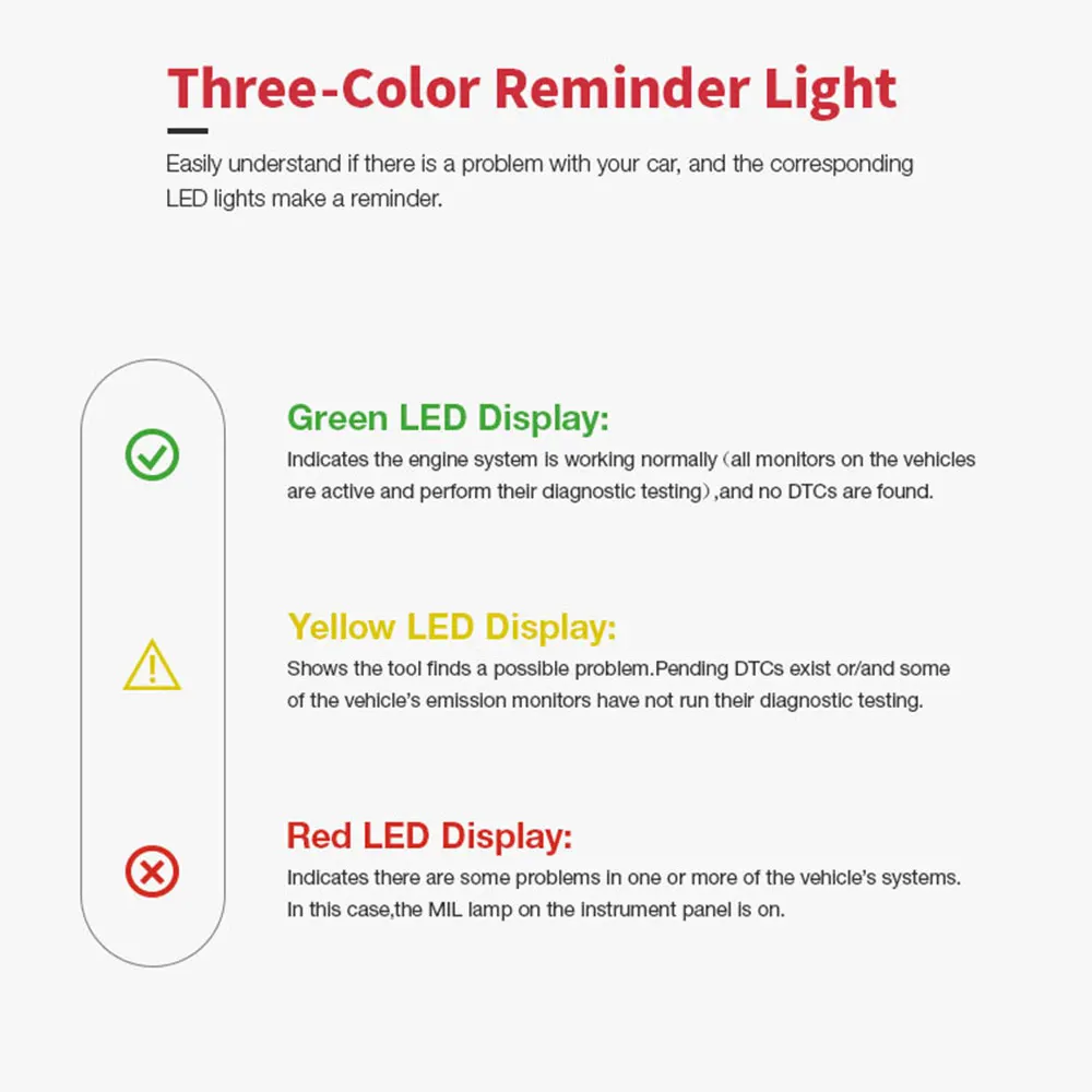 2. Высокое качество и высокое разрешение TFT цветной дисплей поможет вам легко найти проблемы вашего автомобиля.3. Яркие цветные светодиоды и встроенный динамик обеспечивают визуальный и звуковой тон для проверки готовности.