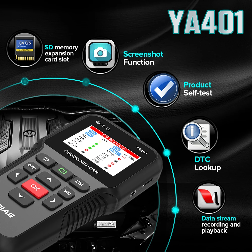 YA401 sup port s и дизельные и бензиновые транспортные средства, если автомобиль совместим со стандартными протоколами OBDII, с диагностическим портом OBDII 16pins