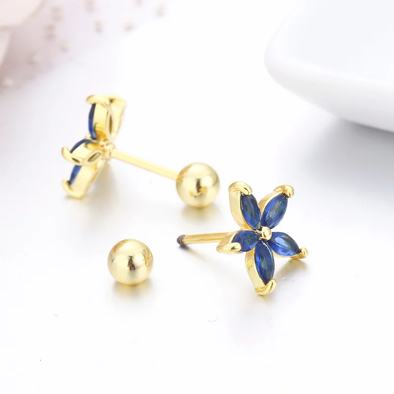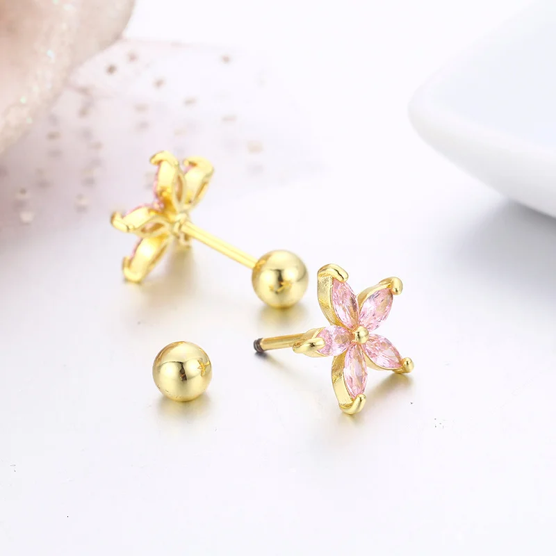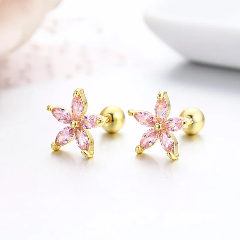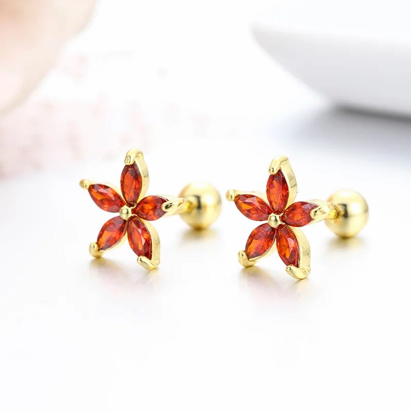 Серьги-гвоздики с пятилепестками и фианитами, 7 цветов