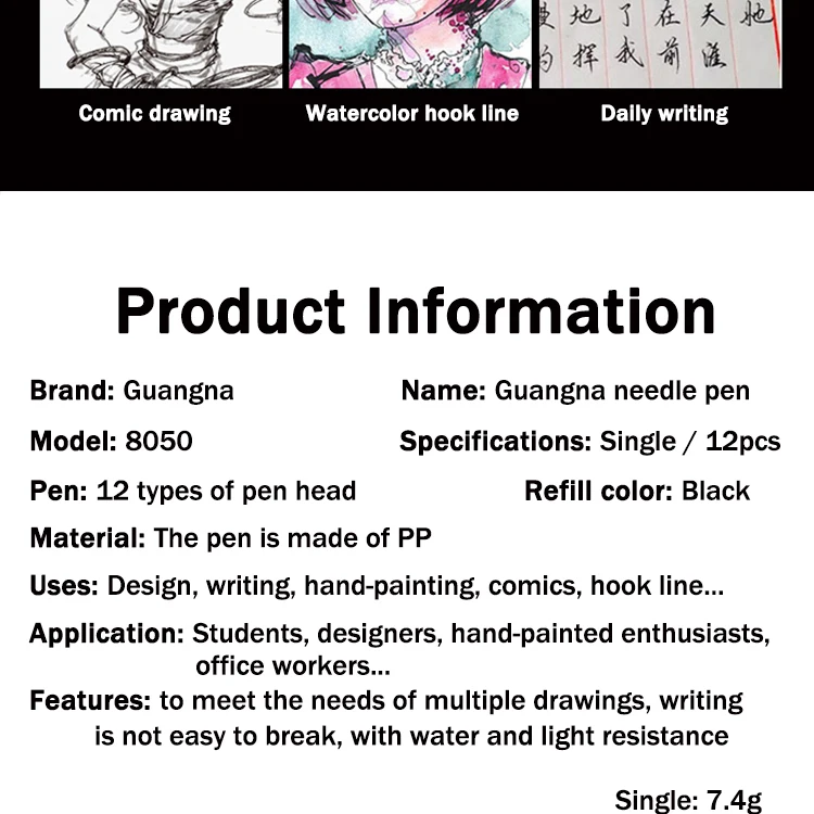Guangna ручка для рисования с микроновыми графическими иглами, черная ручка с крючком для набросков, 005 01 02 03 04 05 07 08 1,0 2,0 3,0, кисть с мелкими линиями 8050
