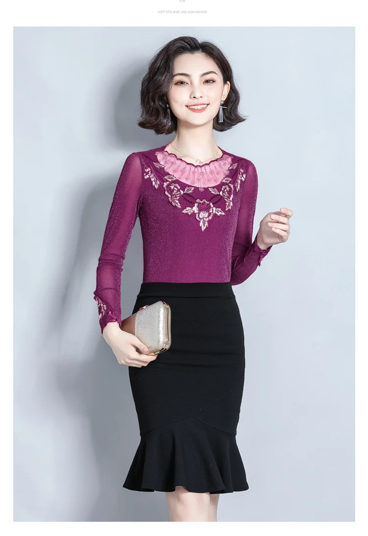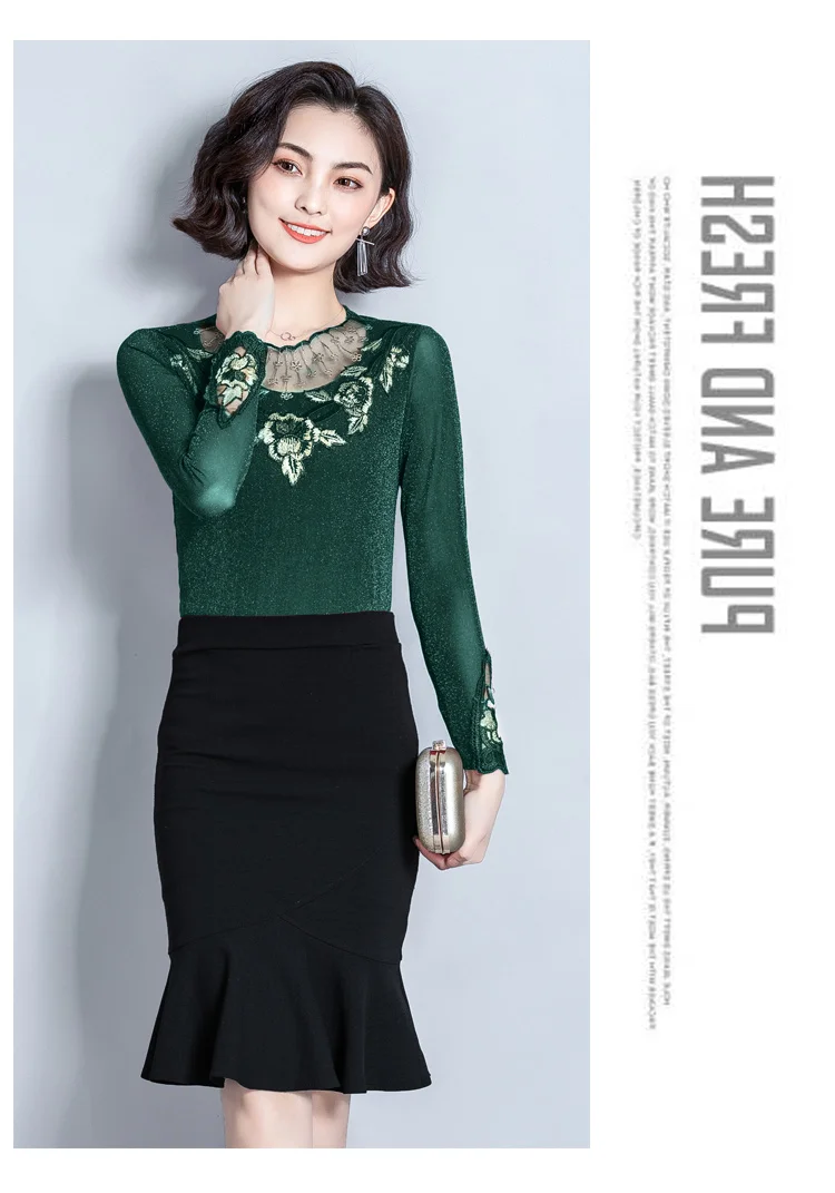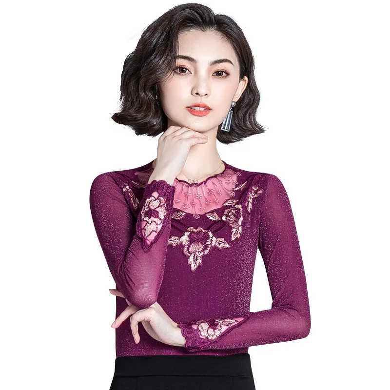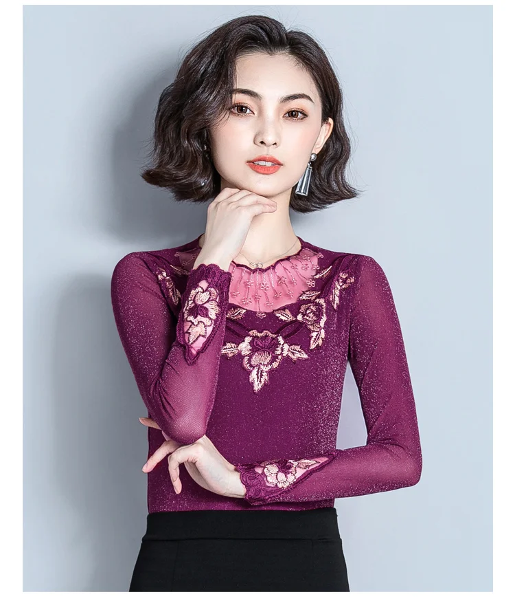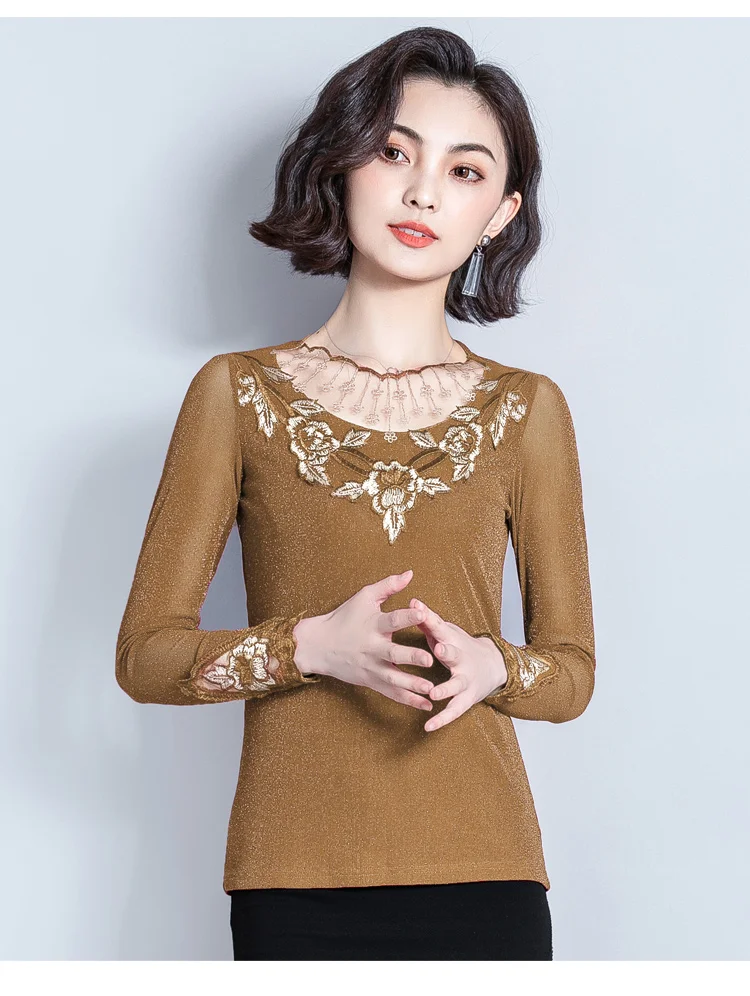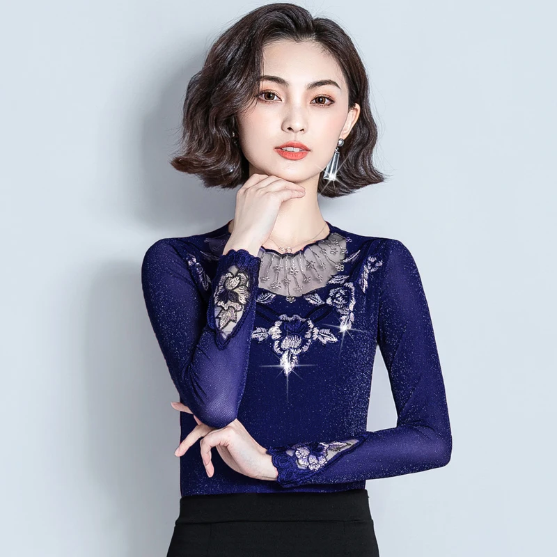 Женская блузка с длинным рукавом, облегающий кружевной топ с воротником-стойкой, в Корейском стиле, 2022 50, 7021