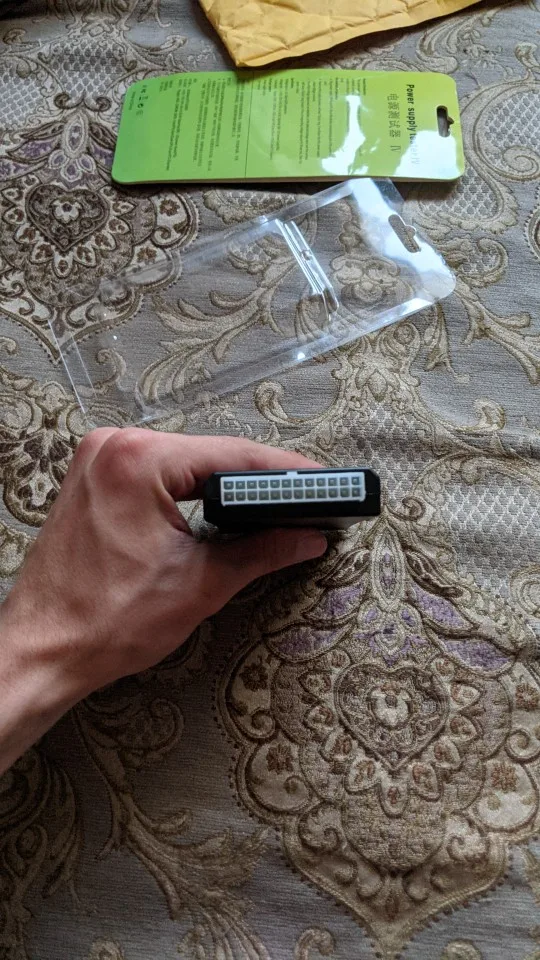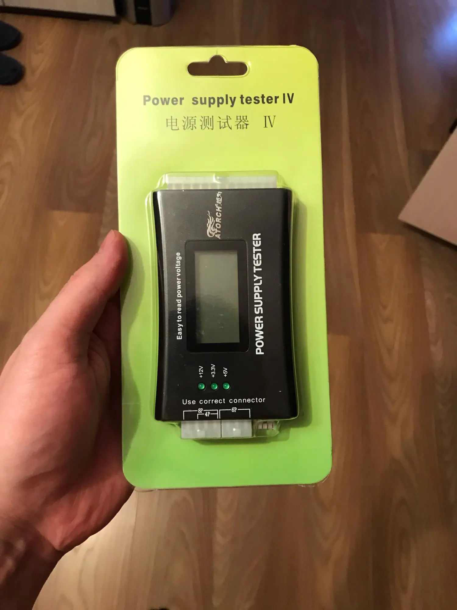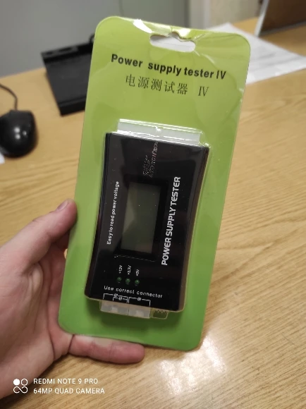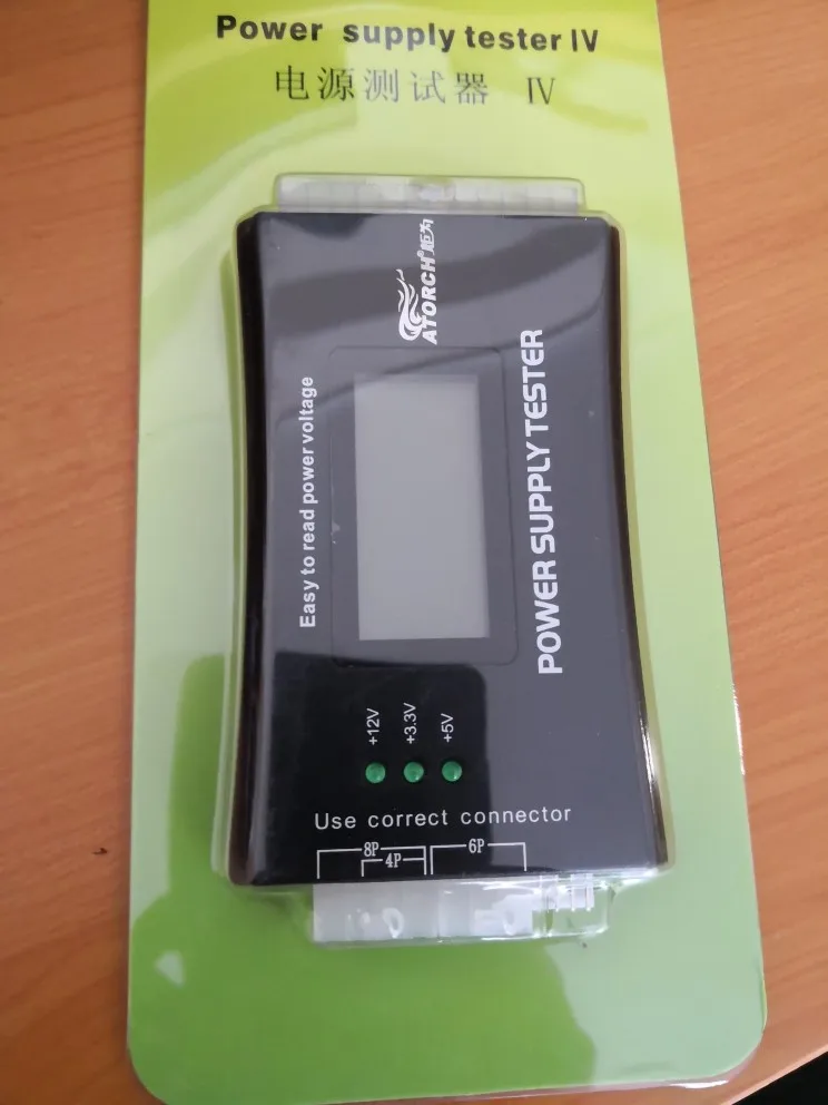 Девайс работает. Кнопок никаких на нем нет. Батареек тоже нет. При подключении 24-пиновой гребенки девайс включает блок питания сам и начинает отображать входящие параметры. Пищит, если не подключено 4-пиновая гребеночка... Простой, примитивный тестер. Я при подключении 4-пиновой гребенки воткнул ее не туда (в 8-пиновую которая для видеокарты), блок питания и девайс выключились. Я подумал - кабзда.... После отключения - подключения все заработало! Видимо либо сам блок питания либо девайс имеют защиту. Будте внимательны!