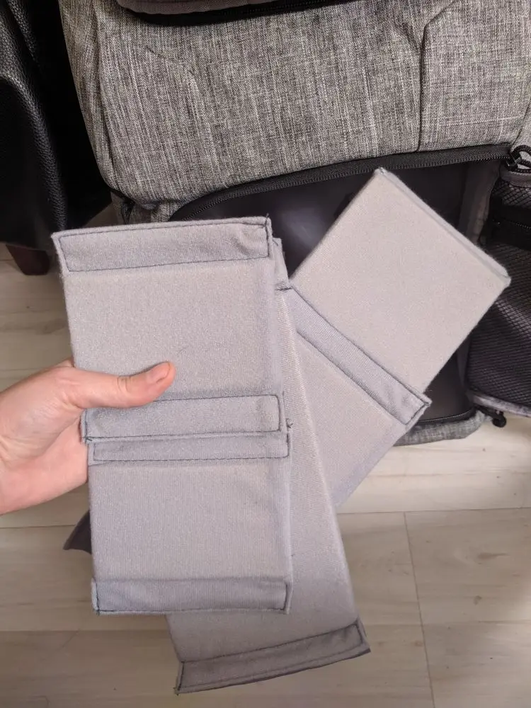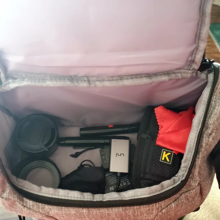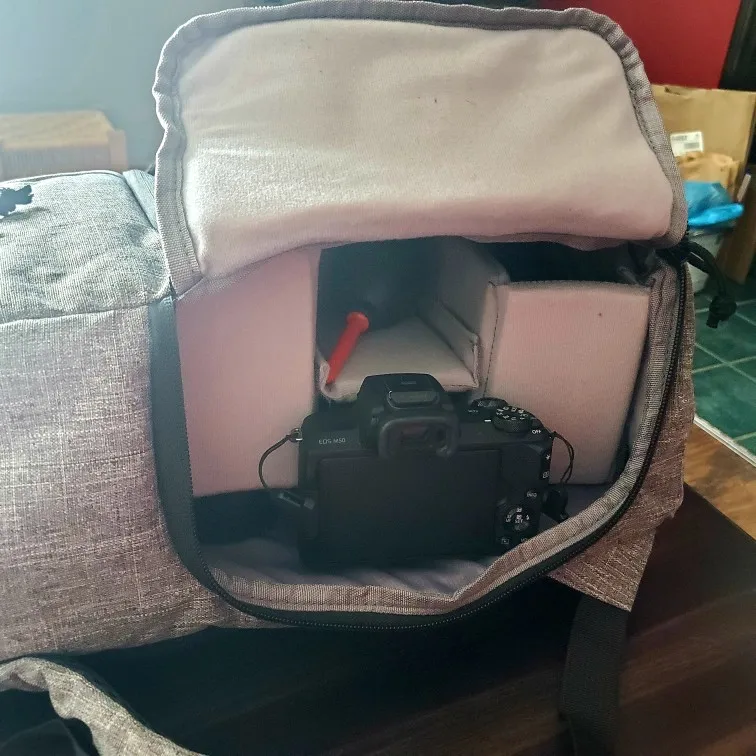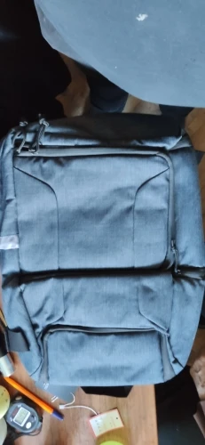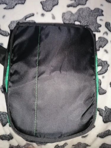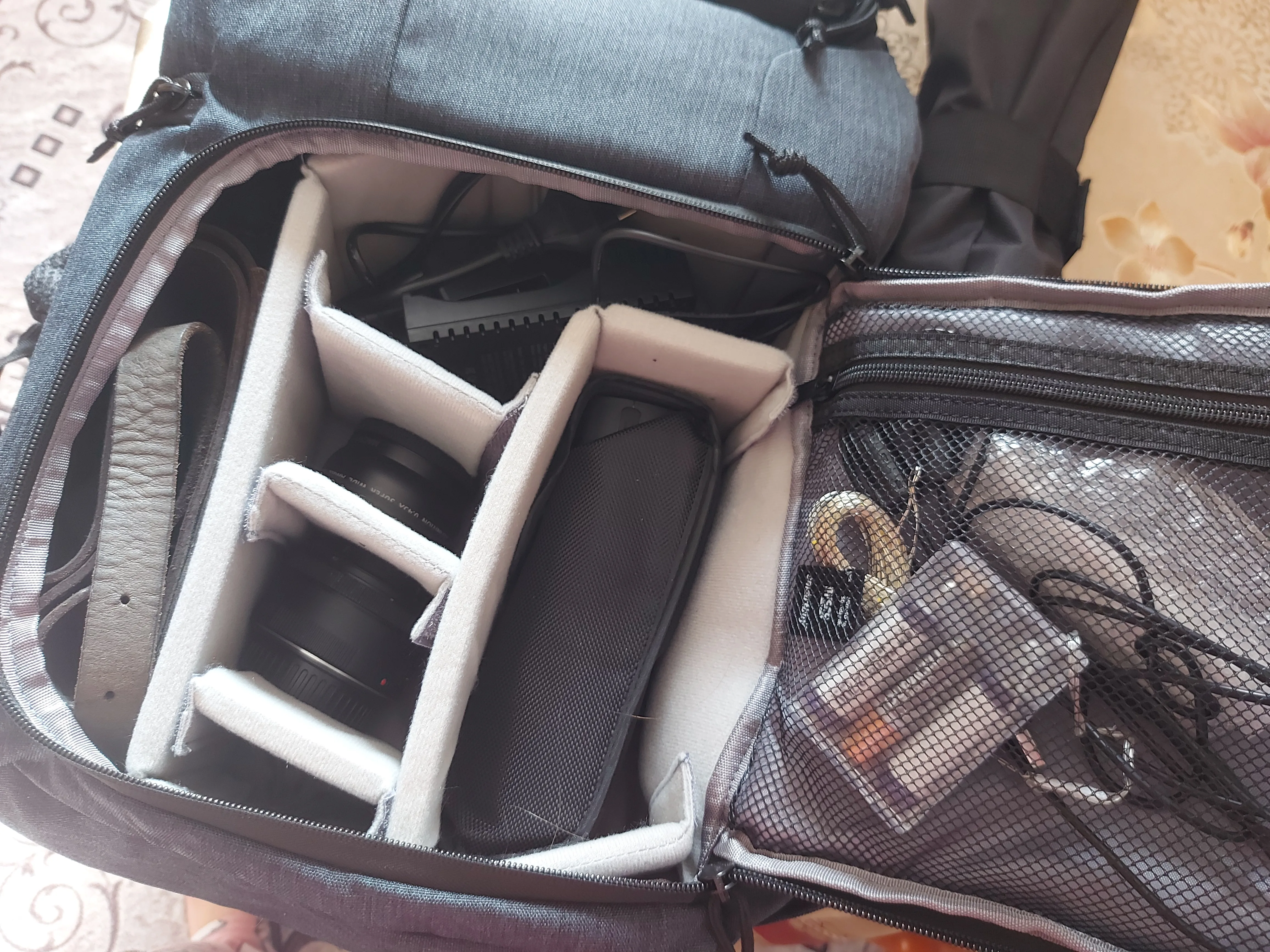 На вид выбирала чёрный, название покупки оказалось blue-china, приехал темно серый с легким синим отливом. Хотела черный. Но в остальном соответствует описанию. Боковые стенки и дно не жесткие из-за чего крепить к ним перегородки на липучках не очень удобно, да и жесткое дно было бы полезно в любом случае. Перегородка между верхним отделением и основным как раз жесткая. Крепить отсеки с учётом жёсткости лучше всего как на картинке, но тогда теряется функциональность бокового клапана. С боковым клапаном, чтобы можно было вынуть фотоаппарат сбоку тоже можно закрепить. но все это немного болтается будучи прикрепленным к мягким стенкам. Сами перегородки не плохие. Толстые, мягкие и достаточно жесткие. Так что если бы не стенки Рюкзака было бы вообще отлично.