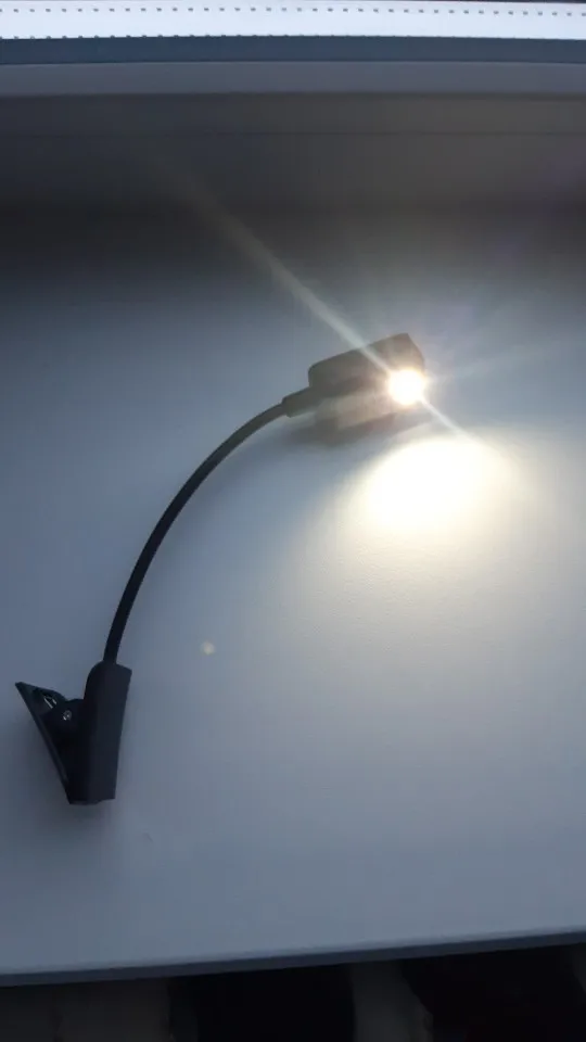 Прикольный фанарик. Несколько хлипкий, ножка относительно гибкая, гнется отрезками, плоховато держится в прищепке. Вцелом, задачу свою выполняет, малюсенький, светит в 2х режимах, читать с ним удобно.