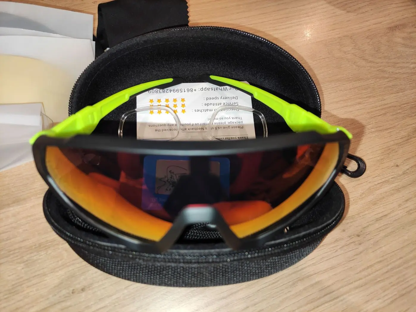 Продавца рекомендую. Очки классные! Качество на высшем уровне, даже не ожидал. Описание и комплектация - всё соответствует!! Отправка шла 1.5 месяца ->> очень долго -12 дней товар " висел " на таможне в Подмосковье без какого-либо движения. Но товаром доволен на все 100%. Рекомендую!