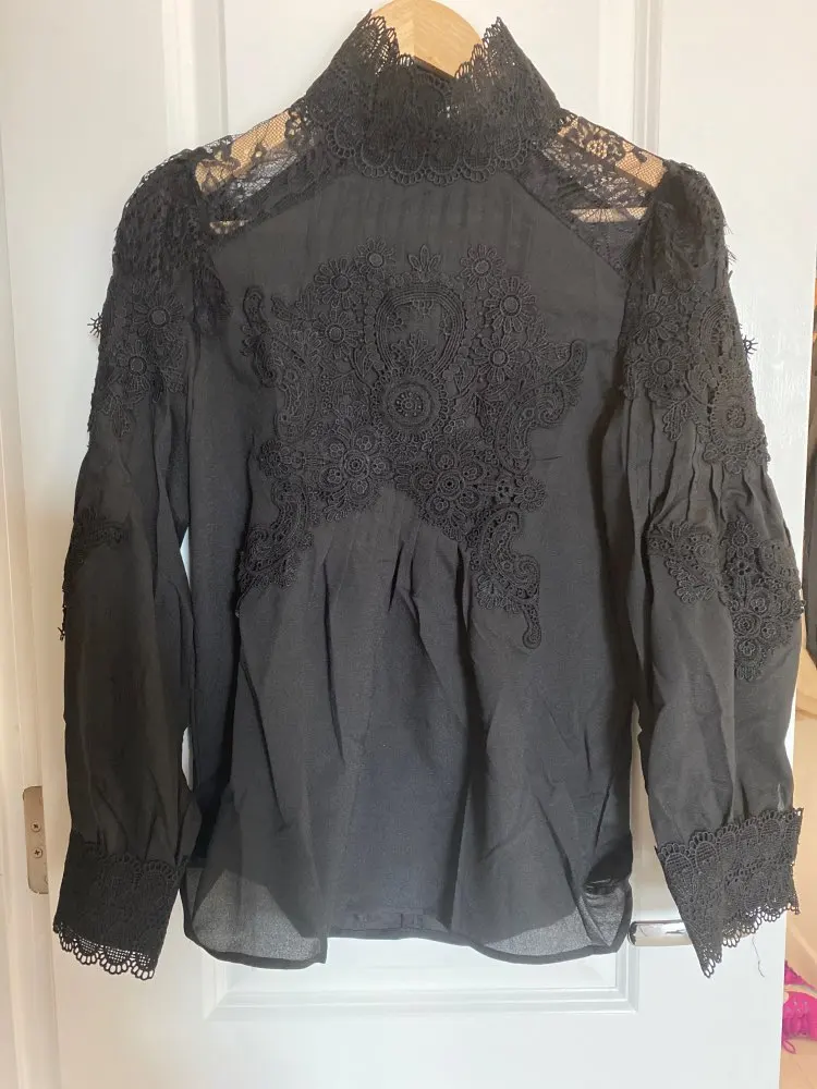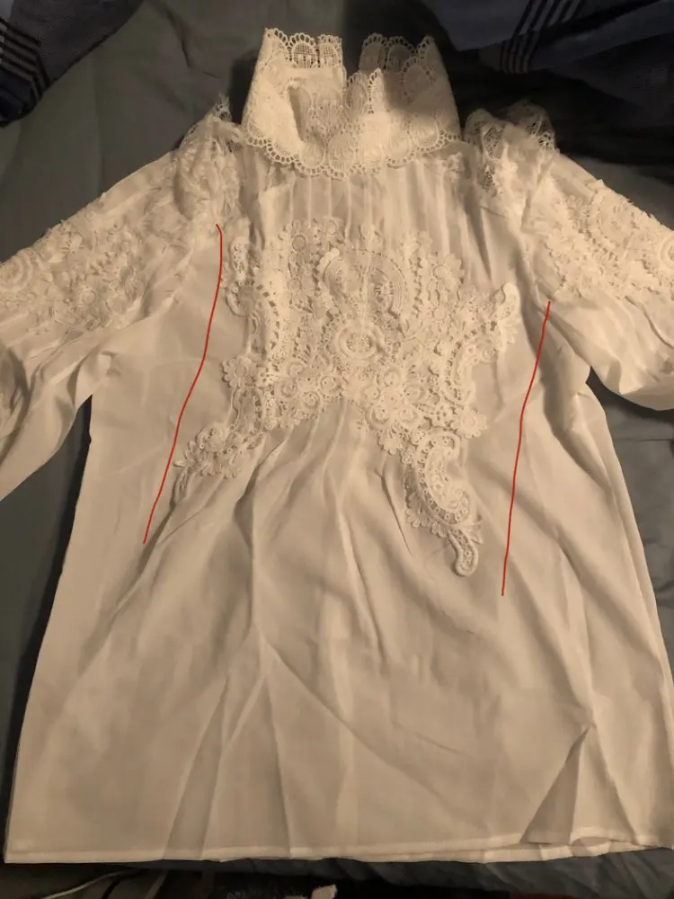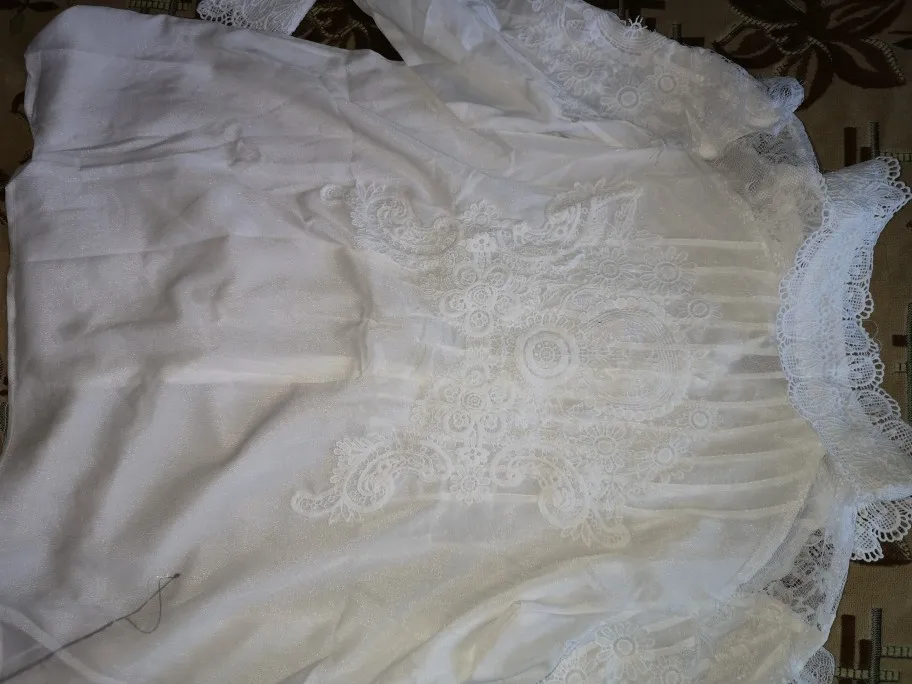 Блузка красивая и эффектная. Качество ткани среднее, грех, что у меня сломанное кружево на левом плече. Мой рост 174 см, обхват груди 89 см, обхват талии 69 см. Правильный размер для длины груди рукава. Удобная молния на спине. Ускоренная доставка в Италию, рекомендуемый товар
