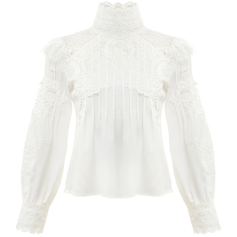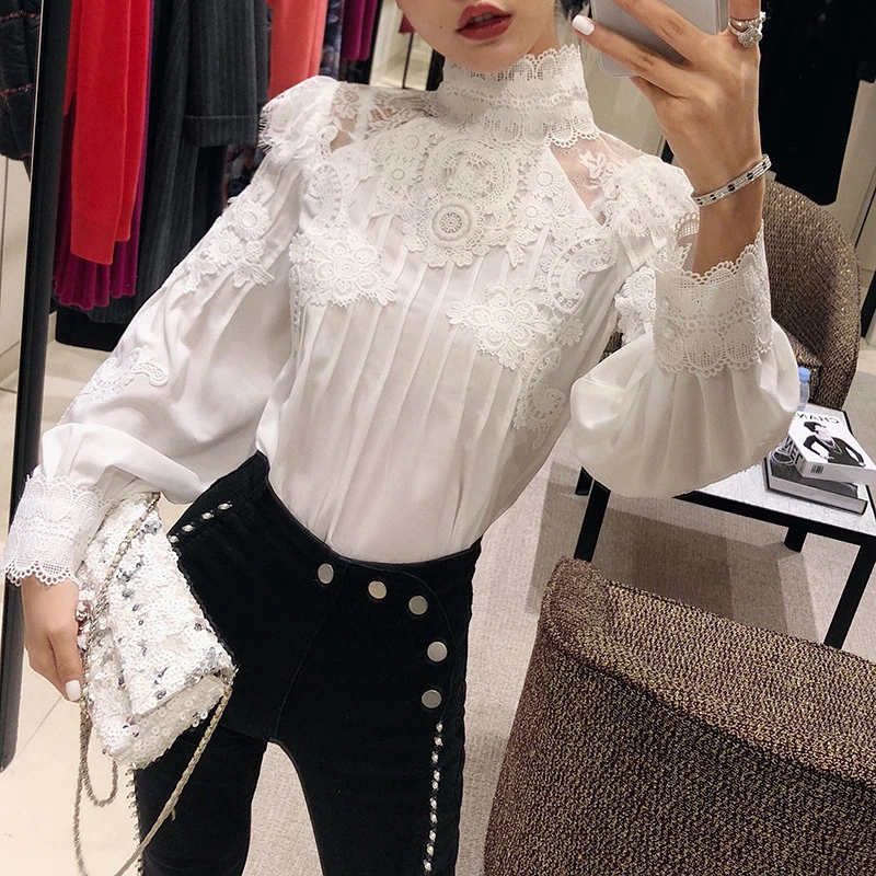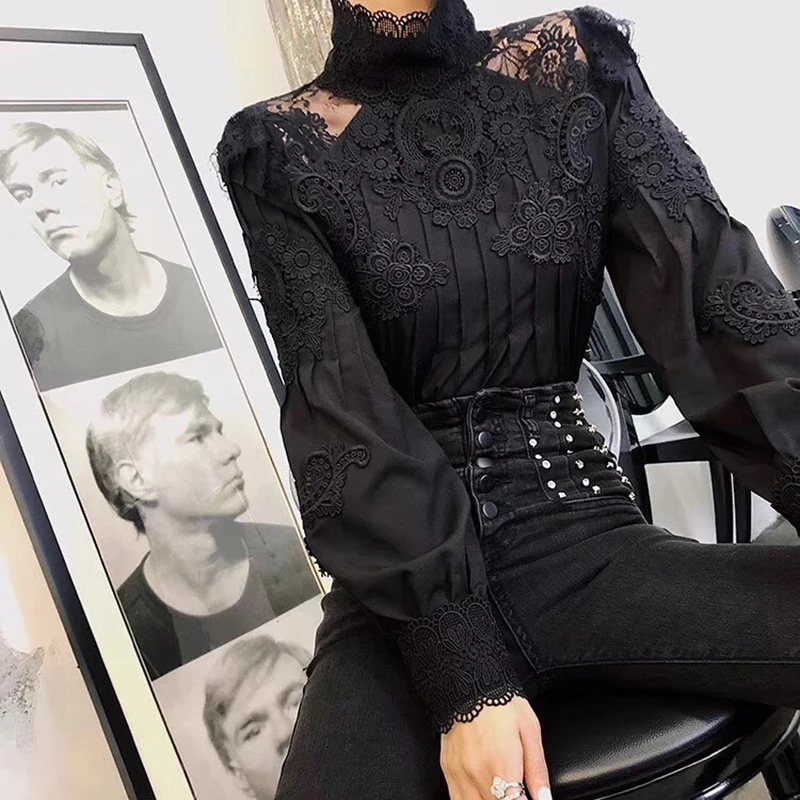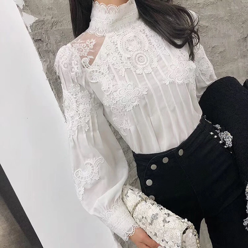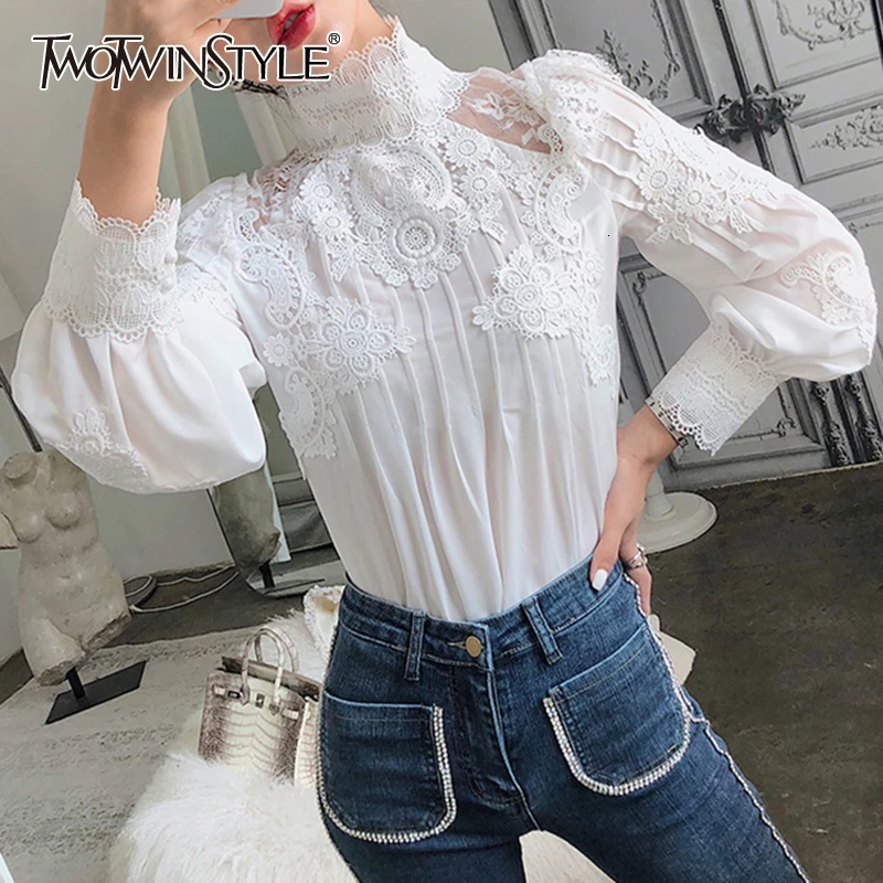 Женская кружевная блузка TWOTWINSTYLE, осенняя, сетчатая, с воротником-стойкой и рукавами-фонариками, 2021