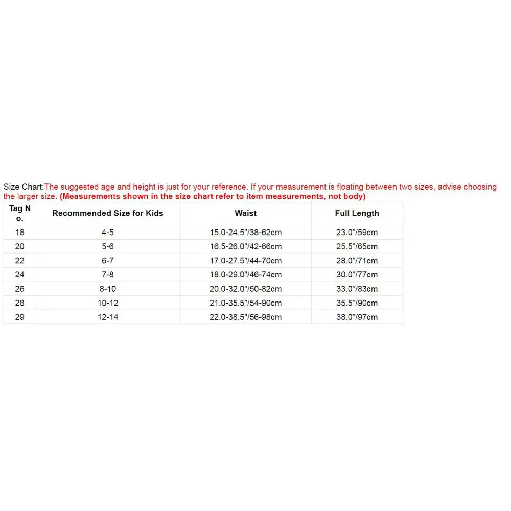 Размер на бирке. Рекомендуется Размеры для детей Обхват талии Полной длины 18 4-5 15,0-24,5 "/38-62 см 23,0 "/59 см 20 5-6 16,5-26,0 "/42-66 см 25,5 "/65 см 22 6-7 17,0-27,5 "/44-70 см 28,0 "/71 см 24 7-8 18,0-29,0 "/46-74 см 30,0 "/77 см 26 8-10 20,0-32,0 "/переменного тока, 50-82 см 33,0 "/83 см 28 10-12 21,0-35,5 "/54-90 см 35,5 "/90 см 29 12-14 лет 22,0-38,5 "/56-98 см 38,0 "/97 смПолезные советы: Замеры делаются вручную, поэтому учитывайте небольшие погрешности. Цвет на фото может немного отличаться от реального товара из-за особенностей цветопередачи различных мониторов.